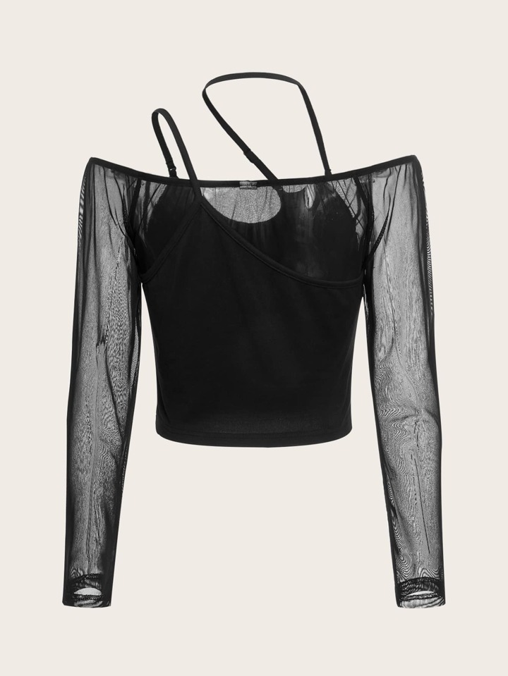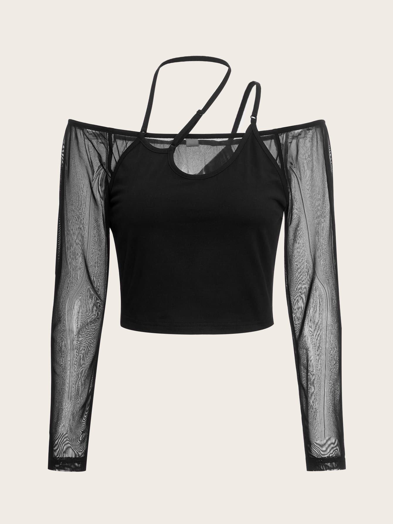 لباس علوي موحدة اللون شبكة متباينة كتف مكشوف