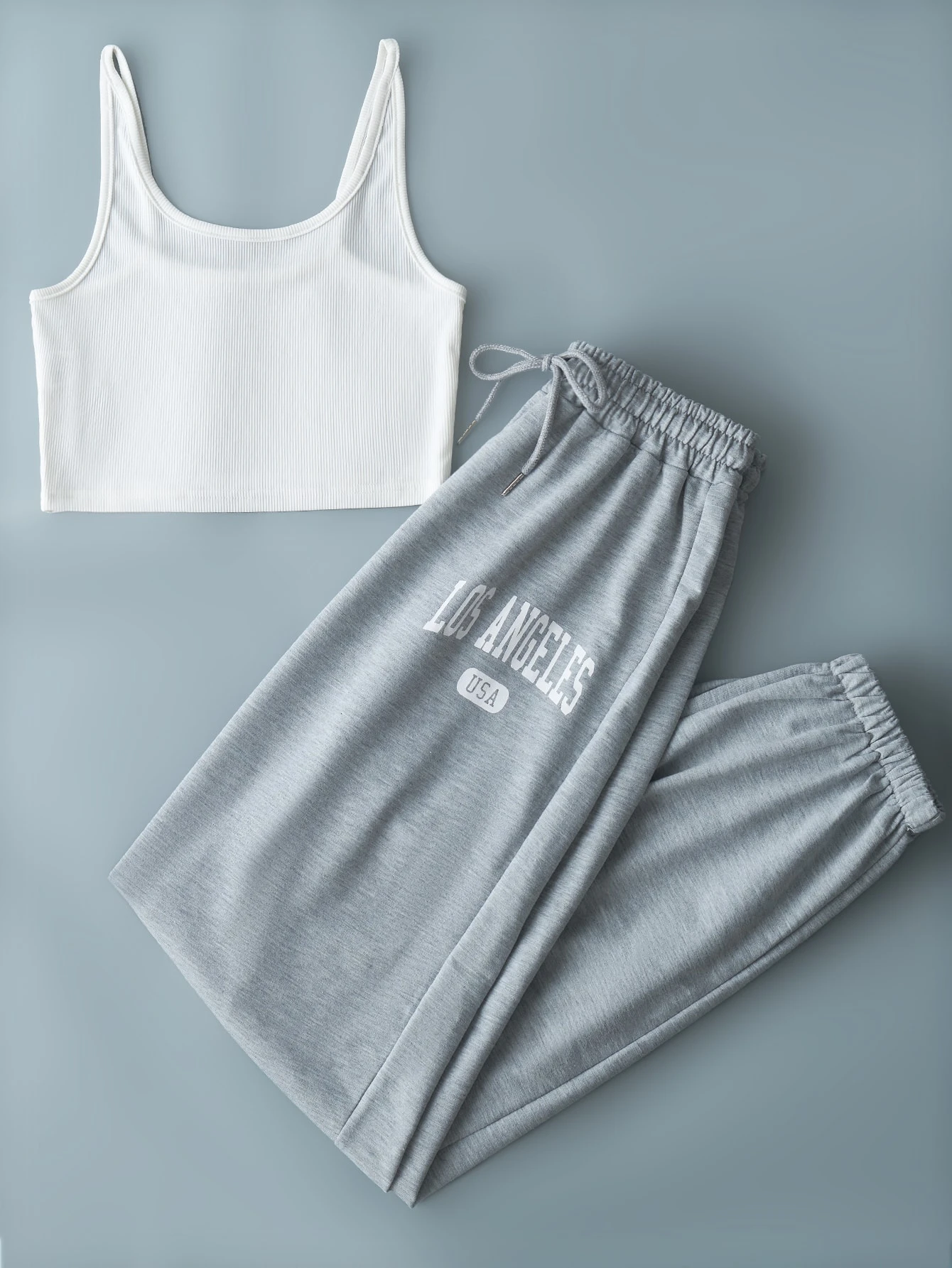 بنطال رياضي برباط وبعبارة مع لباس علوي كامي بلون موحد