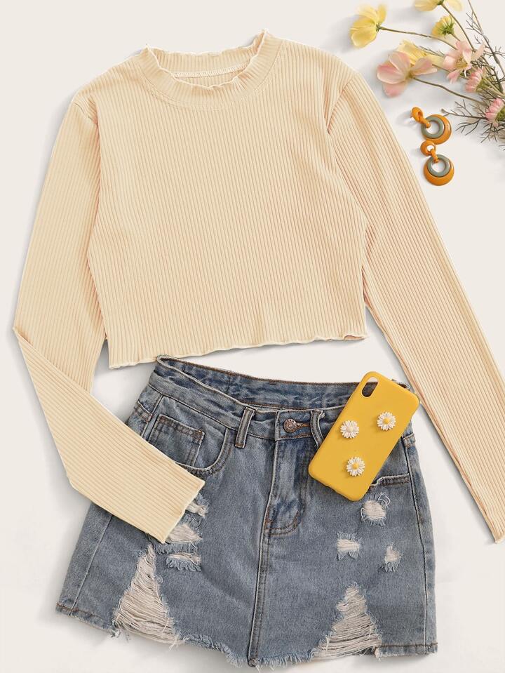 تي شيرت مضلع نمط المحاصيل مقلم نمط الخس وبلون موحد