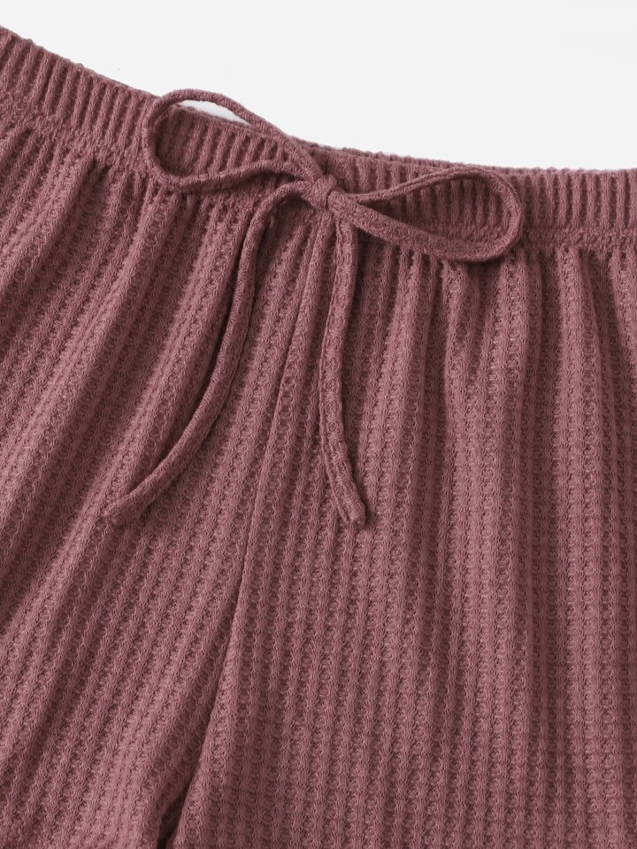 توب كامي مرتبط بالأضلاع وشورت مع تفاصيل عقدة وتي شيرت ذو أكتاف منخفضة، بدلة راحة منزلية، ملابس خريف وشتاء