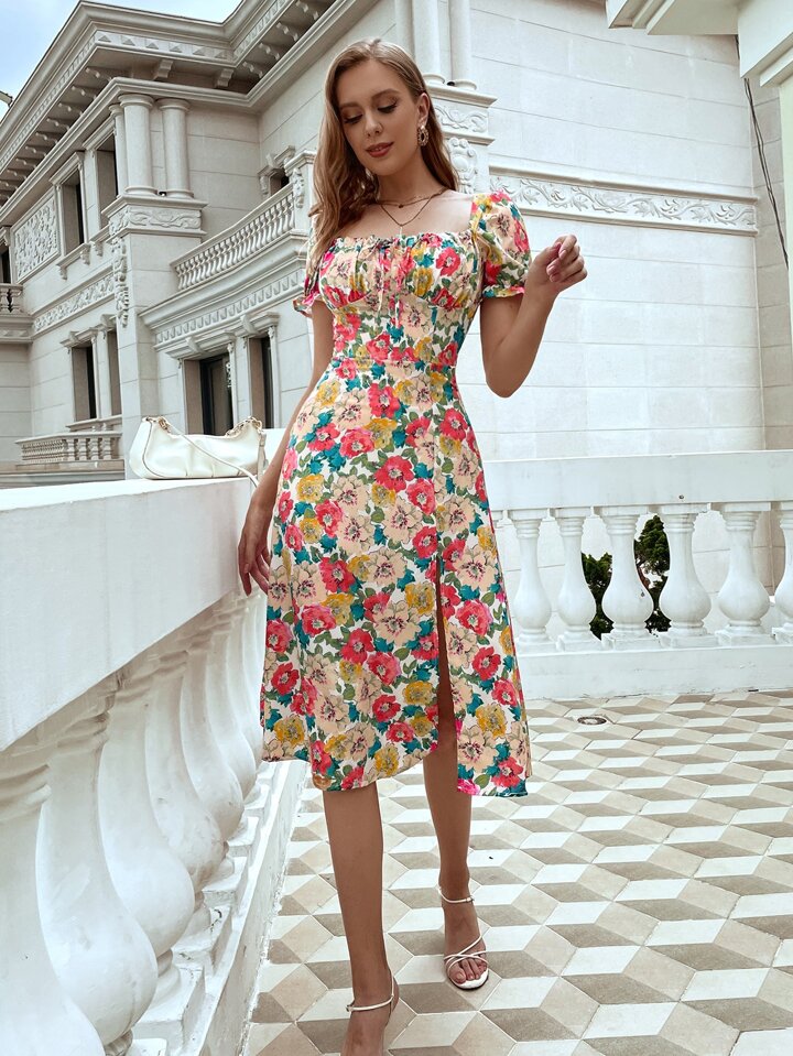 فستان حلابة مزهر بفتحة للفخذ