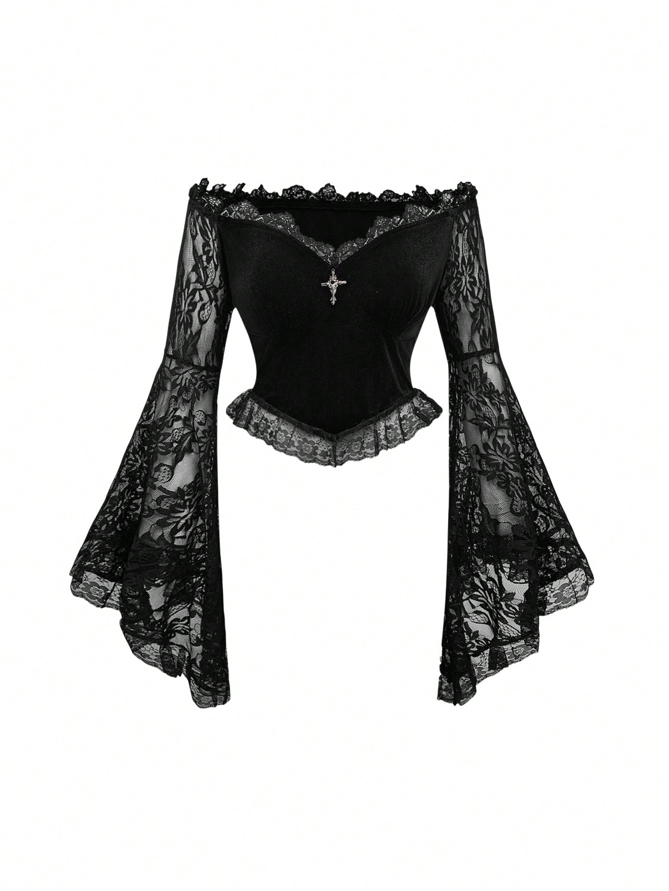 Goth توب نسائي مناسب مصنوع من الدانتيل والقطيفة مع أكمام جرس منسدلة وياقة على الكتف