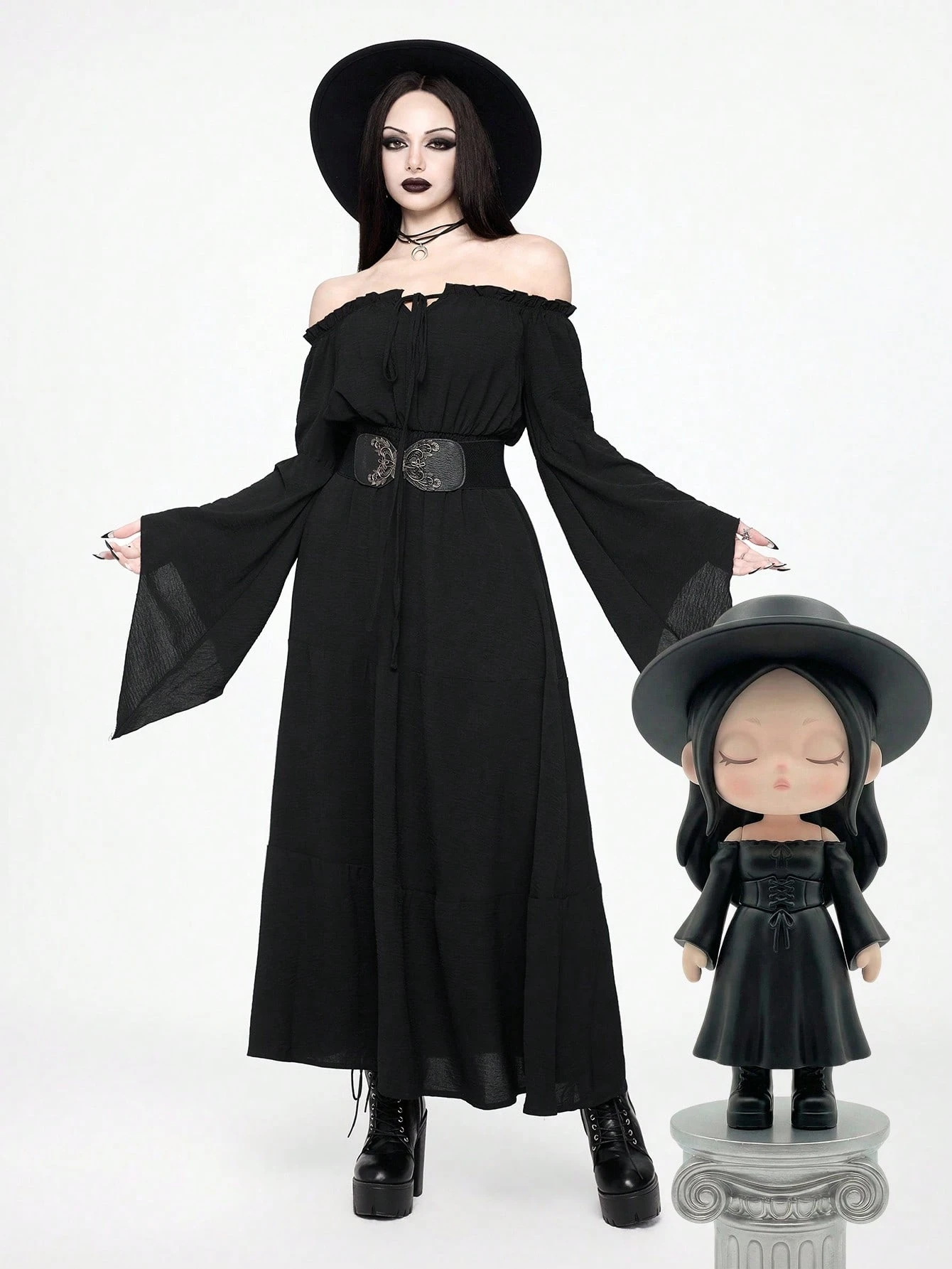 Goth فستان نسائي جوتيك بأكمام واسعة منسدلة وخصر ضيق