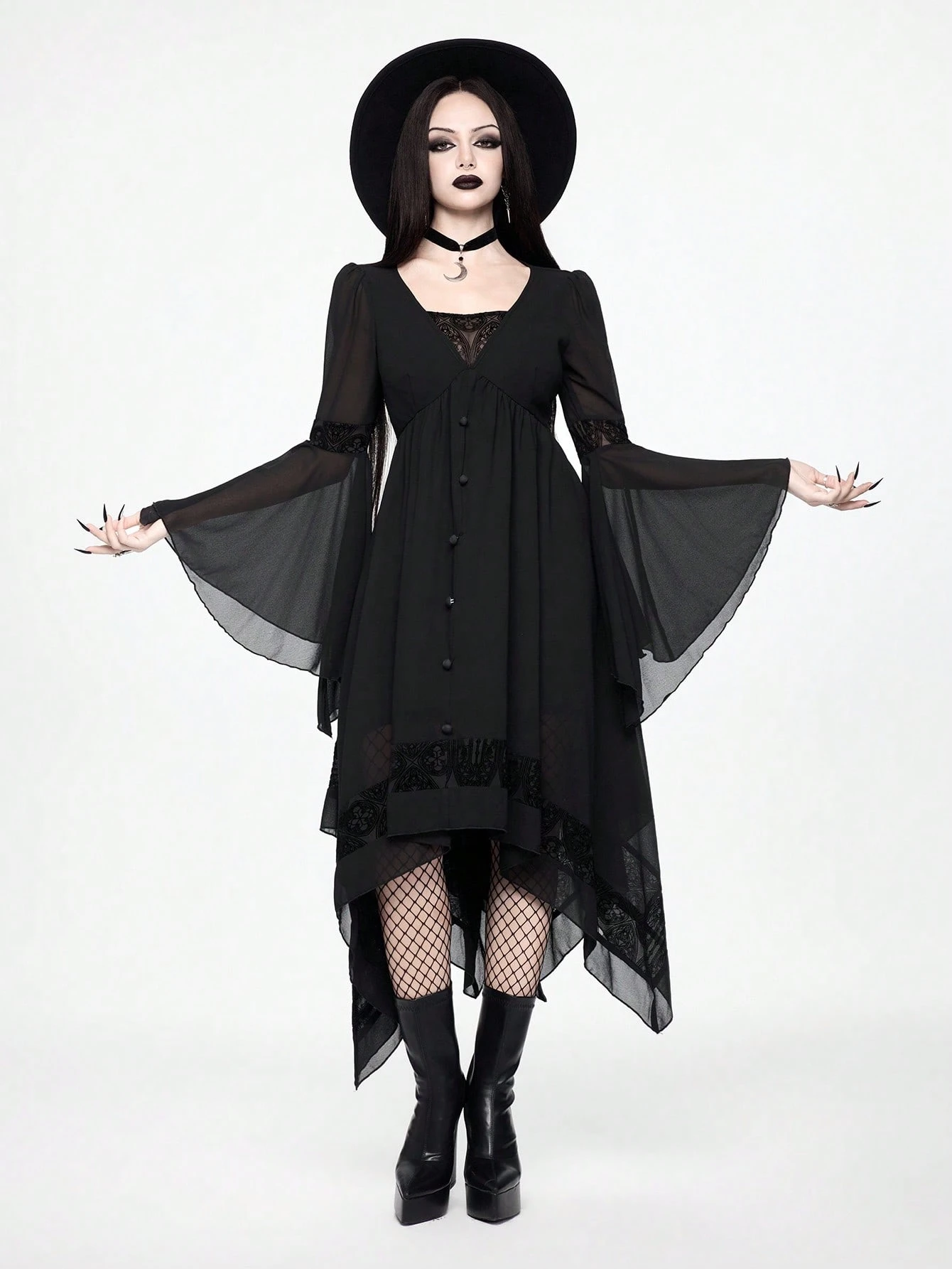 Goth فستان نسائي بأكمام واسعة مزخرف بطبعات ذو تصميم غير متماثل الذيل بطراز جوثيك عتيق