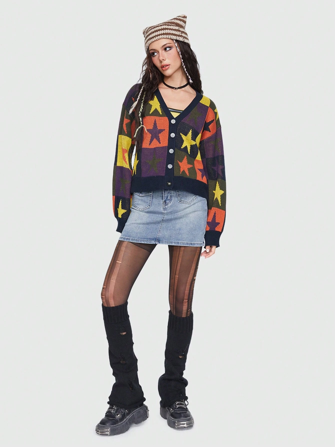 كارديغان سترة بأزرار كتف منخفض الكتف بنمط نجمة