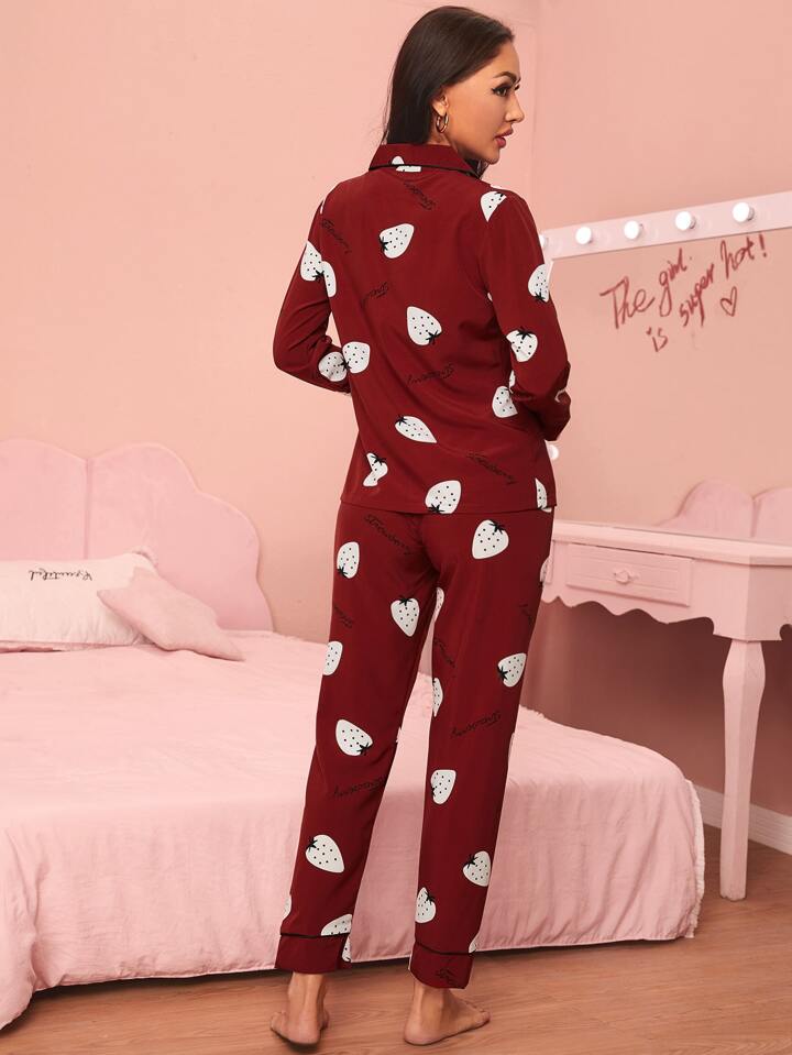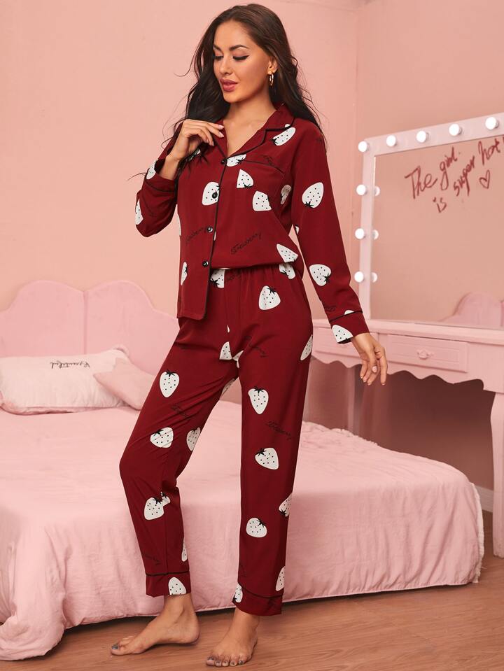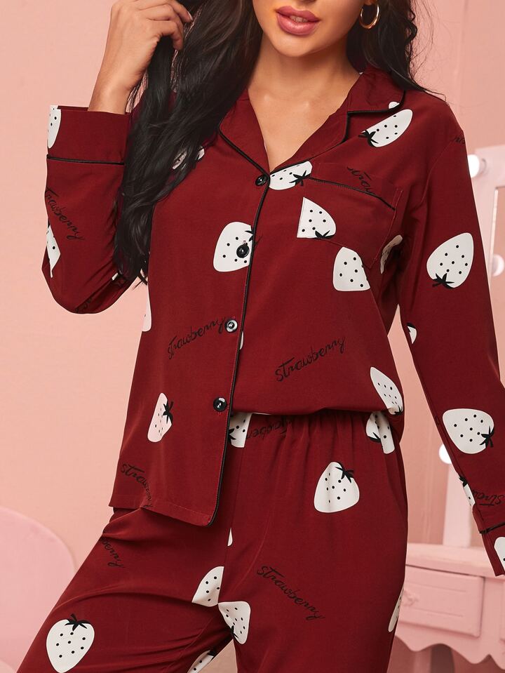 طقم بيجامة مطبوع بالفراولة والحروف، ملابس خريفية