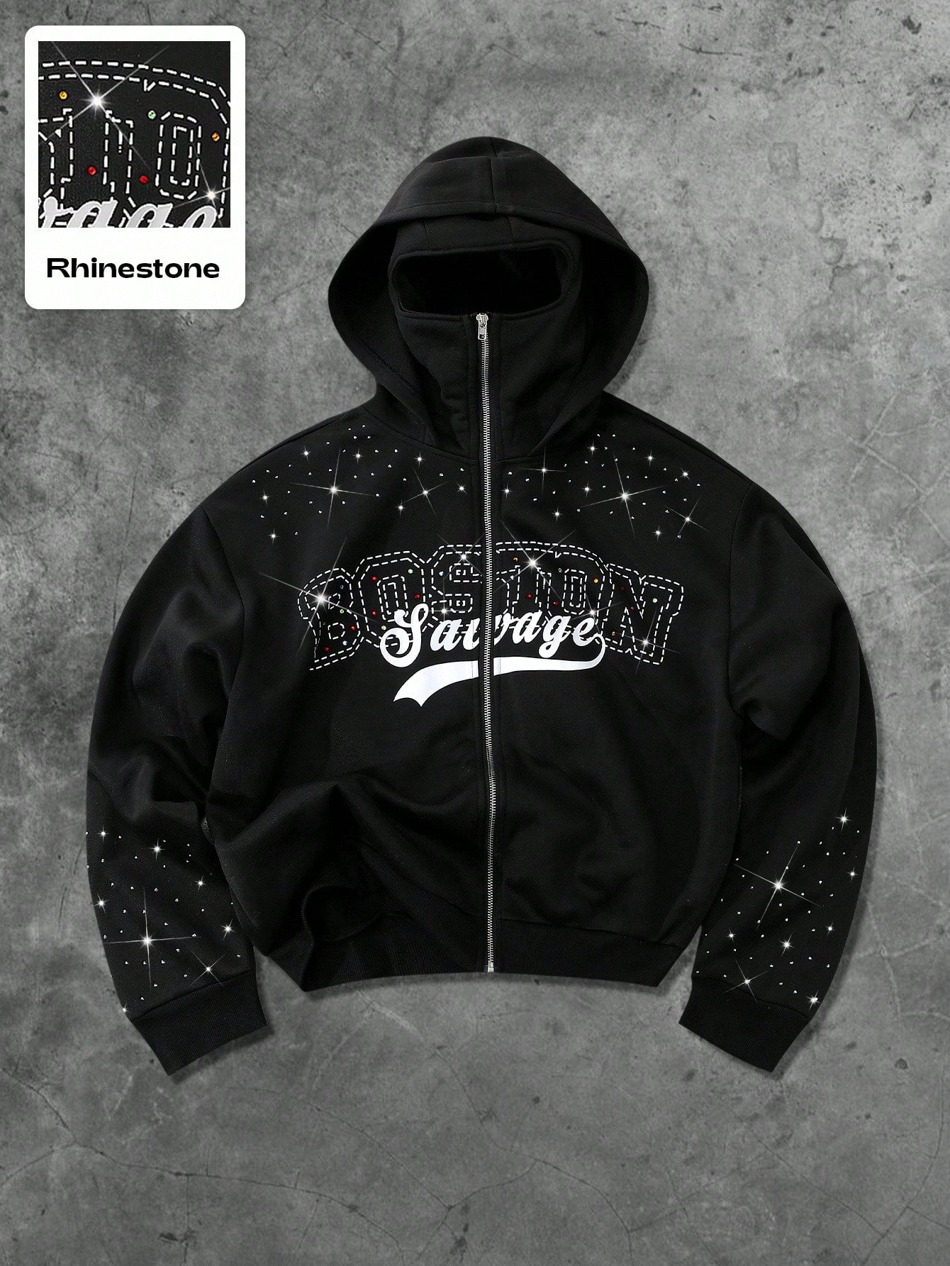 Street Life معطف هودي مزين بالراين ستون ذو طبقتين، سحاب طويل الأكمام، للموسم الانتقالي