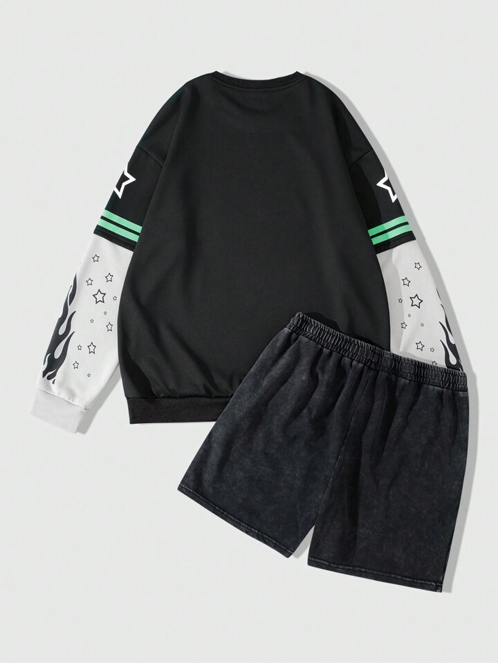 Street Life طقم بلوزة وبنطلون رياضي مريح للرجال بنمط كرتوني وطباعة أحرف بألوان متباينة، مجموعة بذلة رياضية للخريف