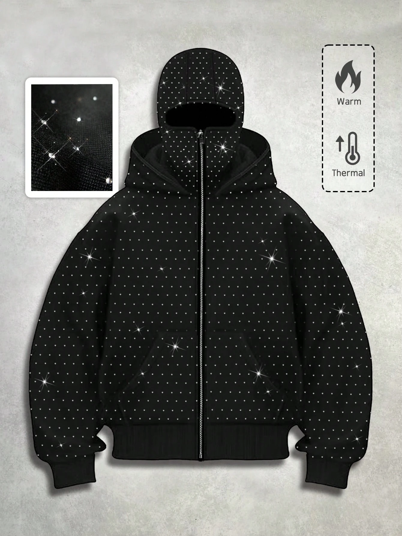 Street Life بلوزة هودي مزينة بالراين ستون مع جيوب، بلوزة هودي أمامية مزودة بسحاب للرجال، خريف وشتاء