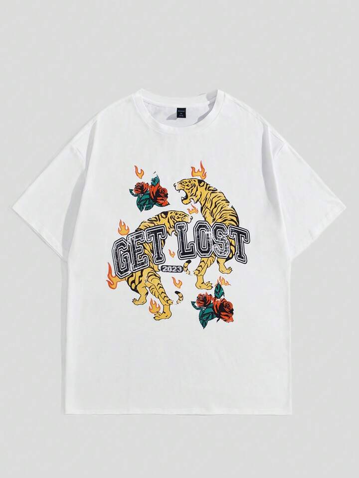 Street Life تي شيرت منخفض الاكتاف بجرافيك عبارة ونمر للشباب