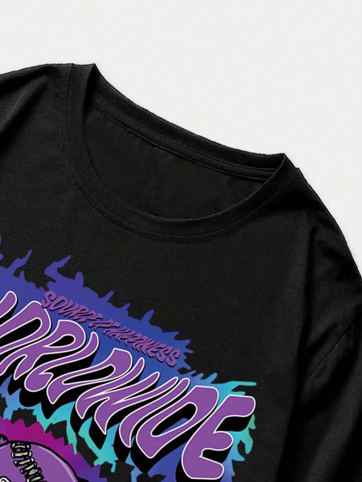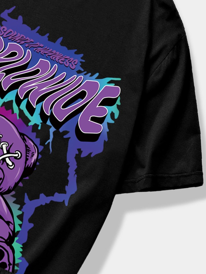Street Life تي شيرت رجالي بطباعة الدب والحرف و شورت مطاطي الخصر مع حواف مخططة ، للمدرسة