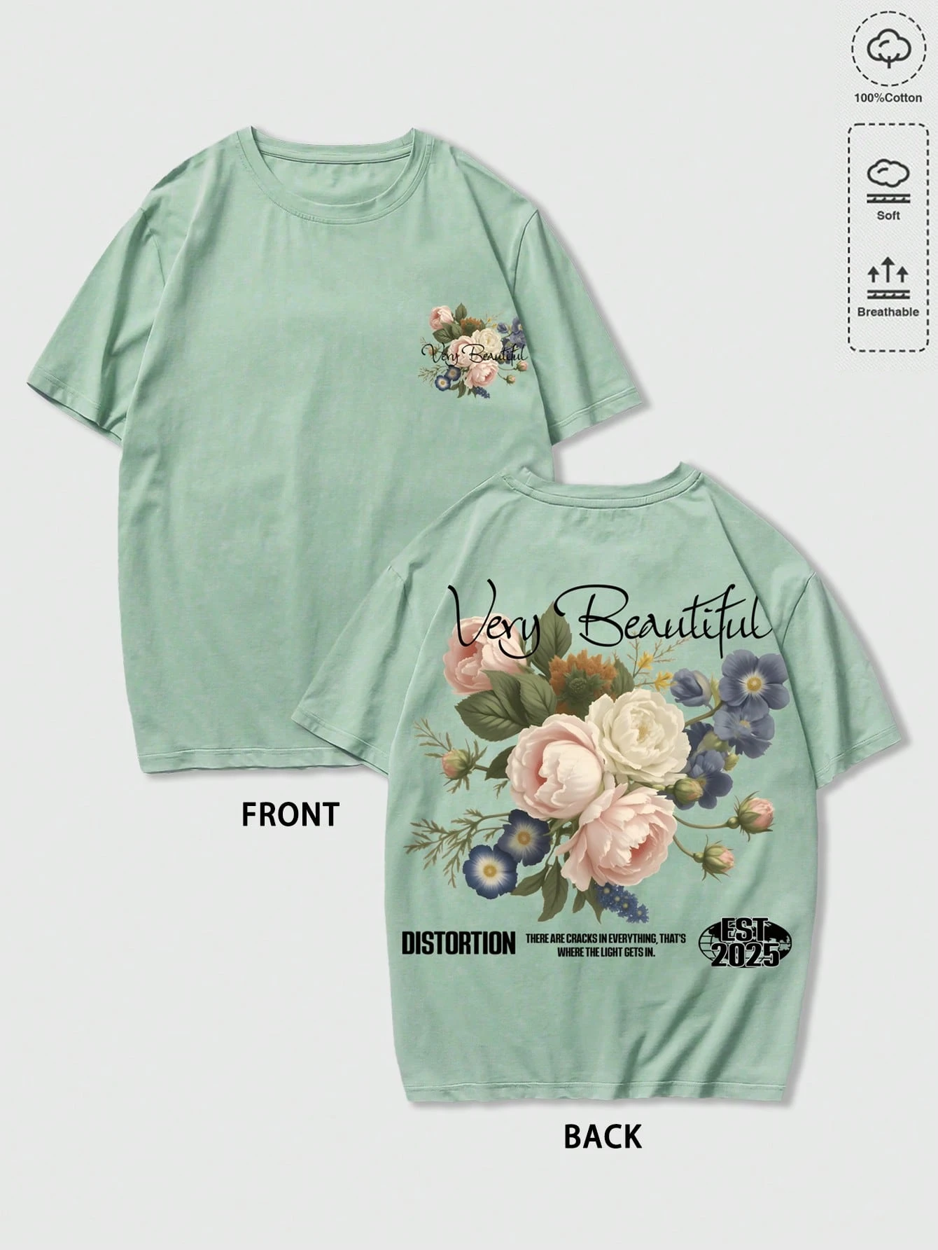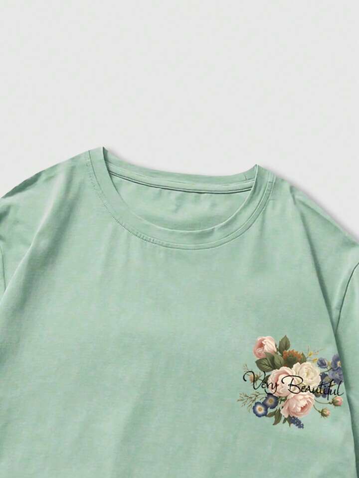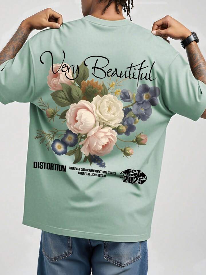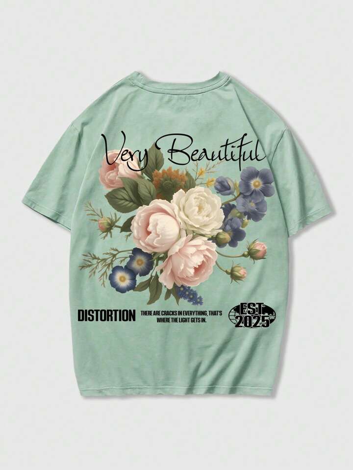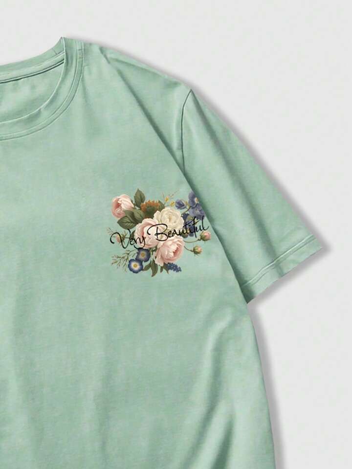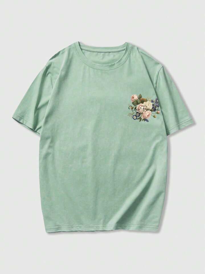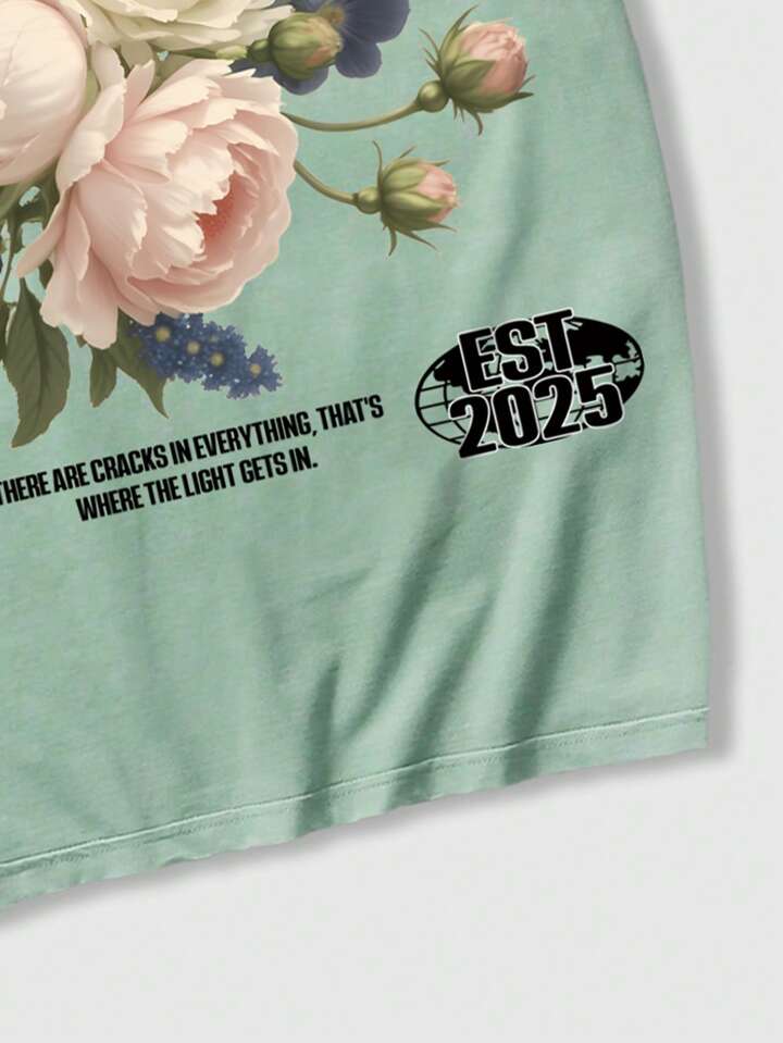 Street Life قميص T-shirt قصير الأكمام أخضر بطراز عارضي، مزين بنقشة زهرية دقيقة على الظهر. النقشة الزهرية تتضمن أزهار زرقاء وبيضاء وزهرية بأحجام مختلفة، مع أوراق وسيقان خضراء. الأزهار مرسومة بدقة بطلة واقعية ومصممة بشكل أنيق. هذا القميص فضفاض وعارضي