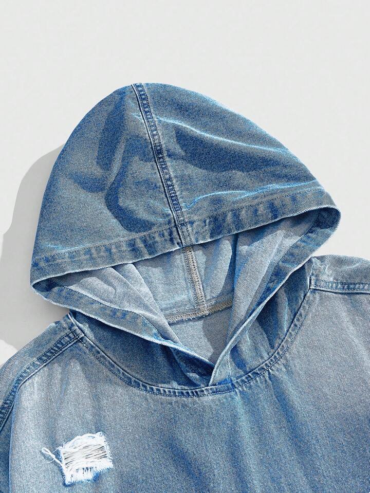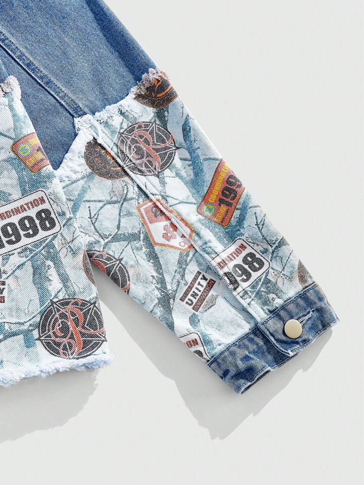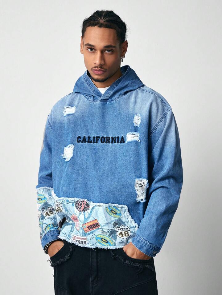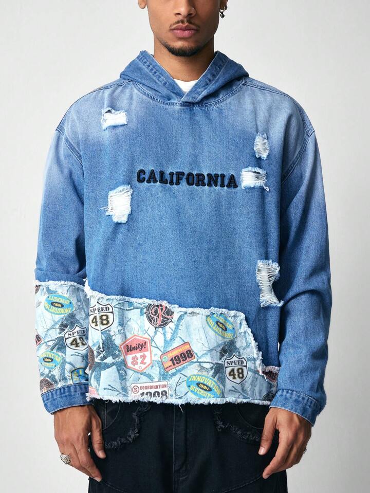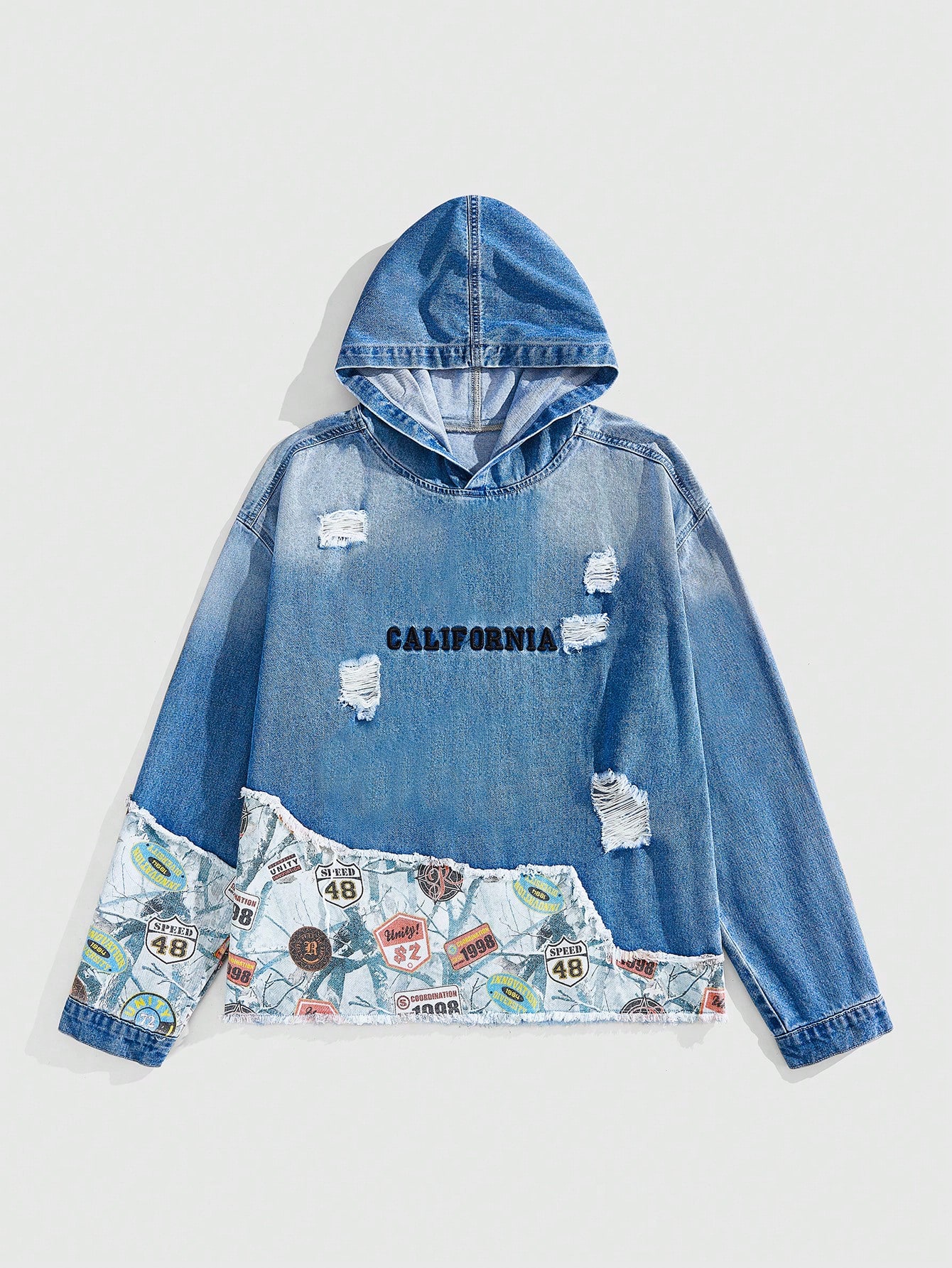 Street Life جاكيت جينز بغطاء للرأس مع رسومات حرفية طويلة الأكمام ممزقة، موسم الخريف