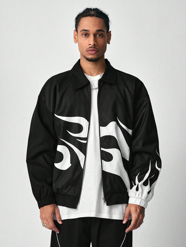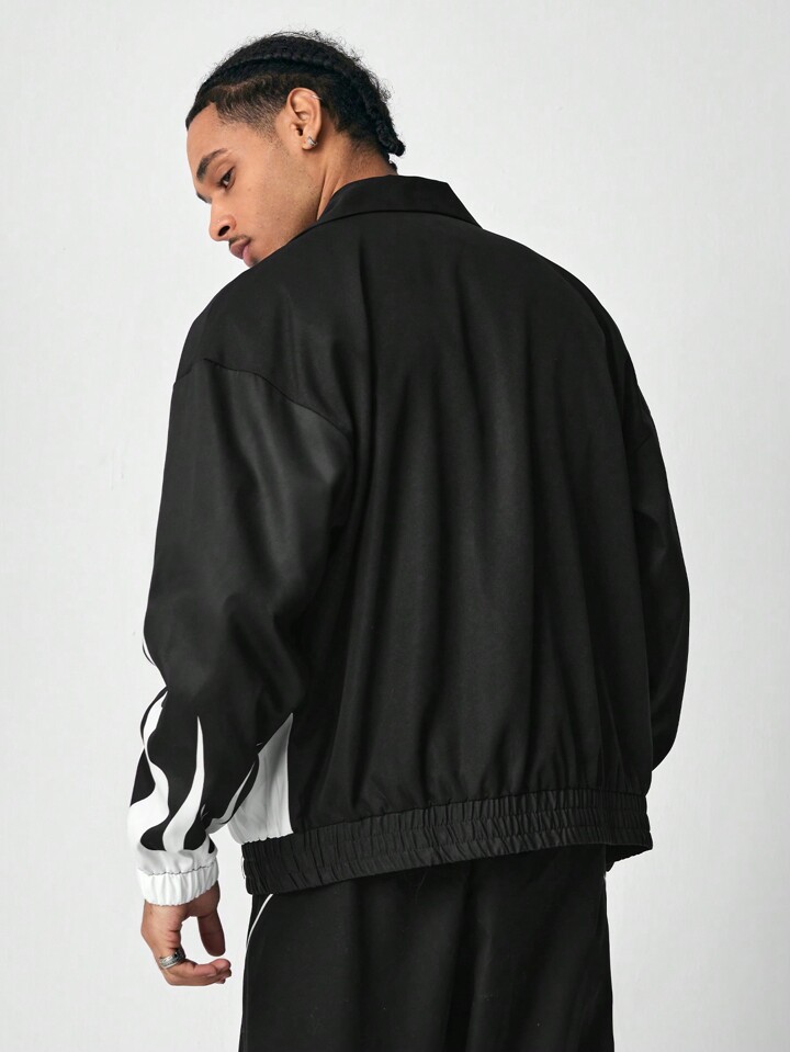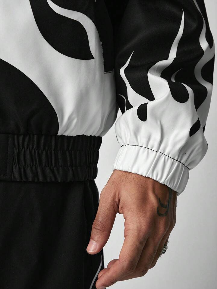 Street Life جاكيت أسود للرجال مع طبعة لهب أبيض وحافة مطاطية ومناطق مرنة في الأكمام