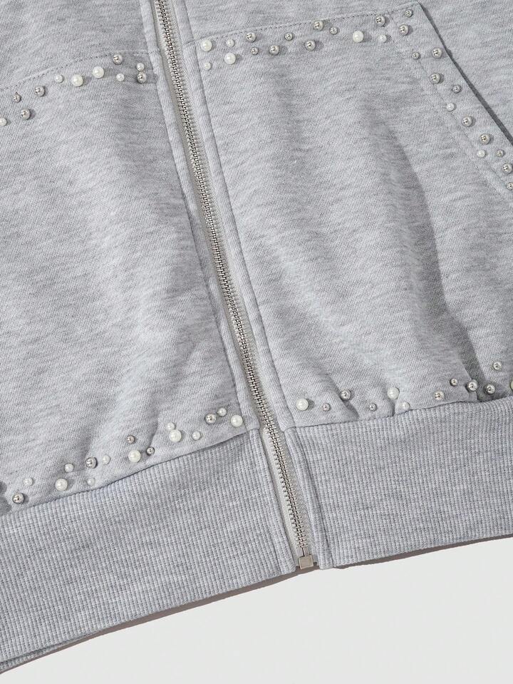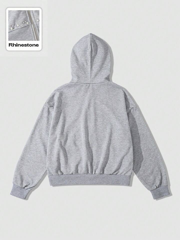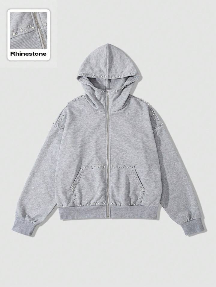 Street Life بلوزة هودي رجالي مزينة بخرز اصطناعي ثلاثي الأبعاد، بسحاب، بتصميم فضفاض قصير