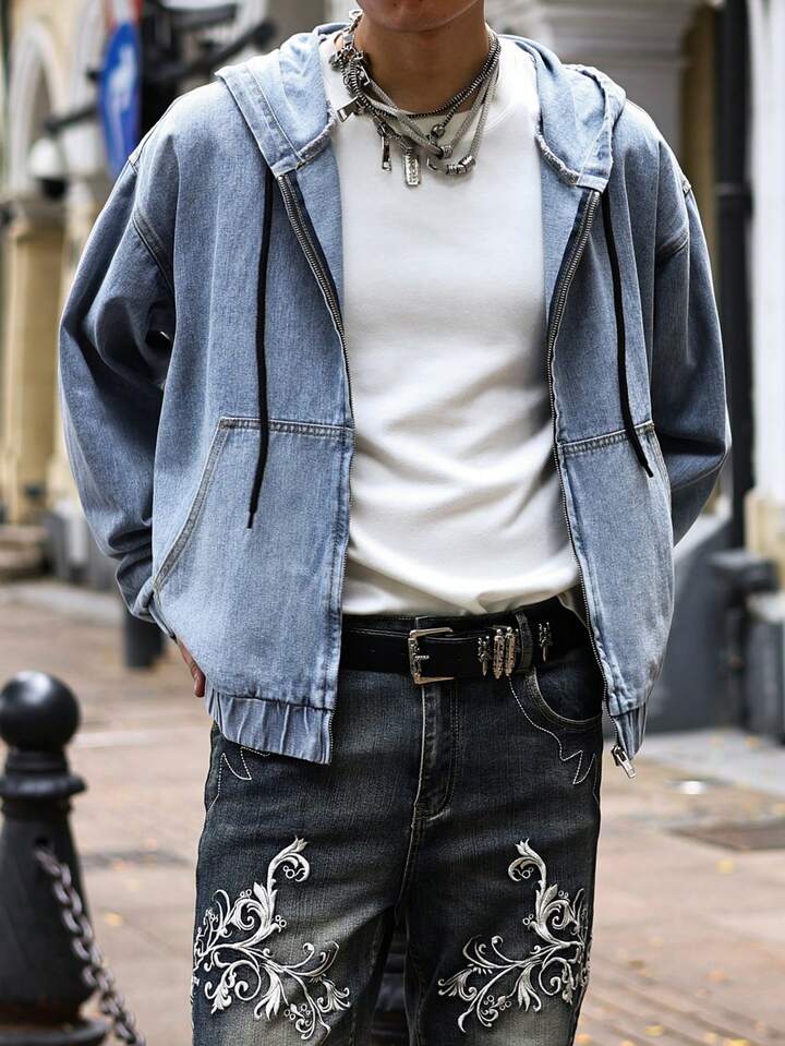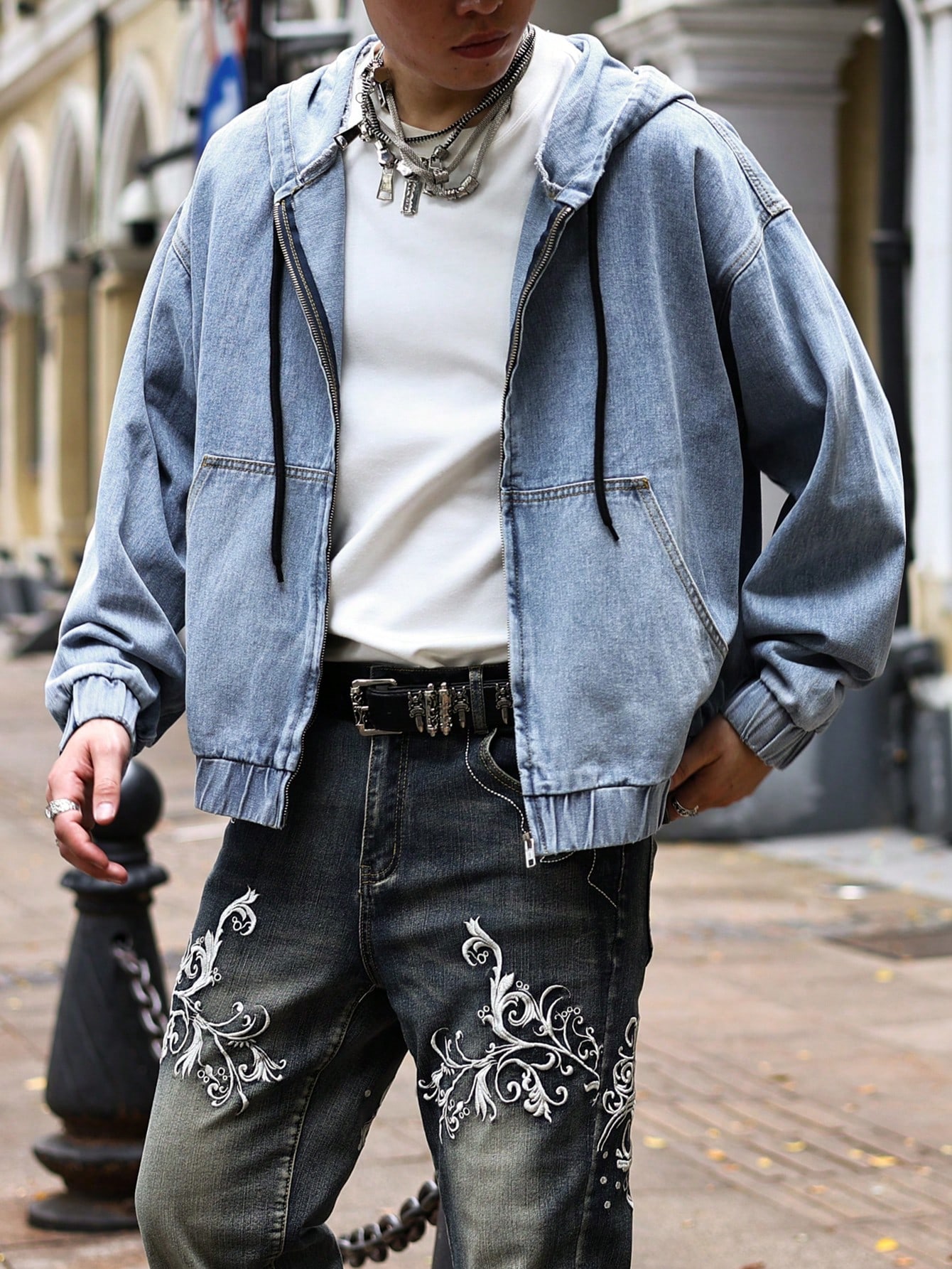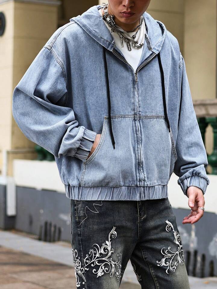 Street Life جاكيت جينز كاجوال مزودة بقبعة مع سحاب أمامي وأكمام طويلة منسدلة للرجال في فصل الخريف
