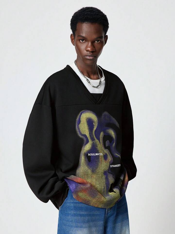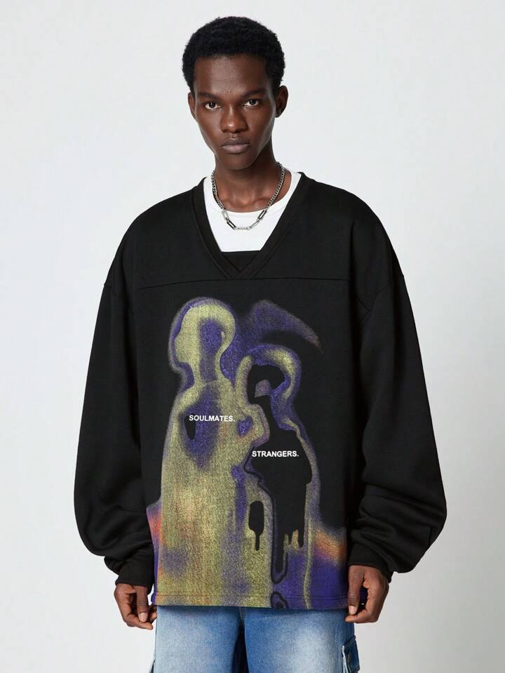 Street Life بلوزة كنزة طويلة الأكمام مطبوع عليها رسومات حرفية وتجريدية أنيقة للرجال، ملابس الشارع