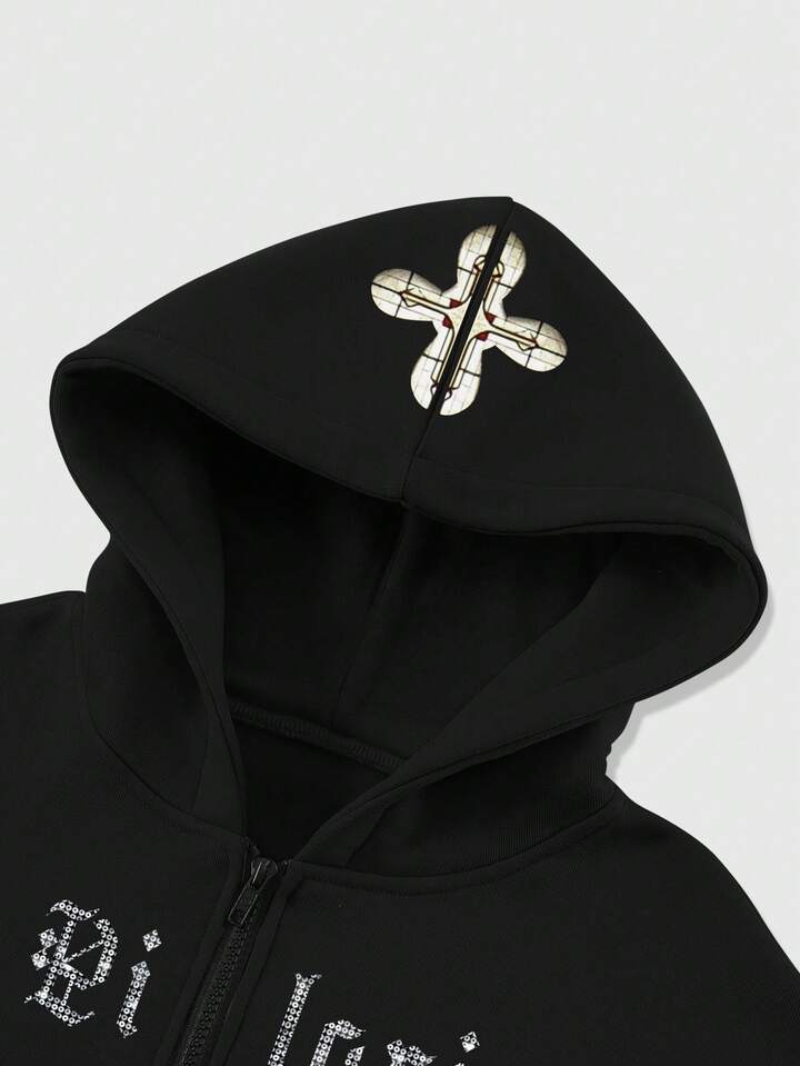 Street Life بلوفر رجالي بسحاب وغطاء للرأس مزين بحرف ولهب مرصع بالراين لفصلي الخريف والشتاء