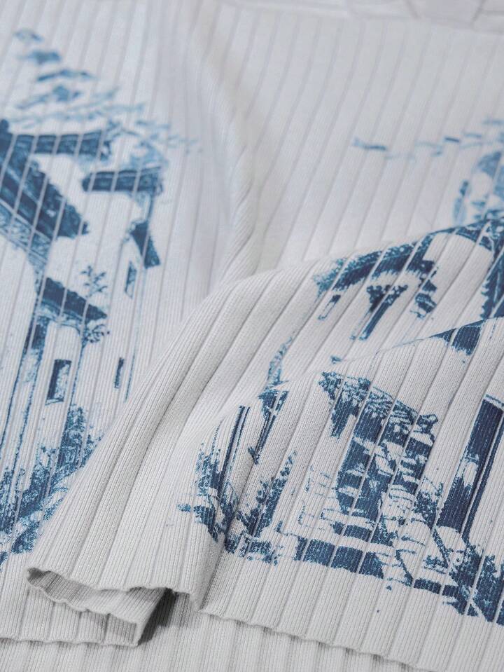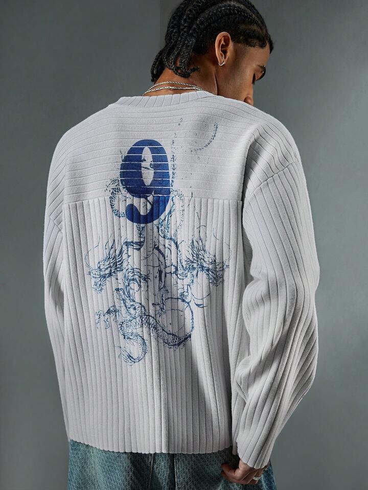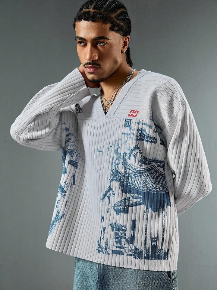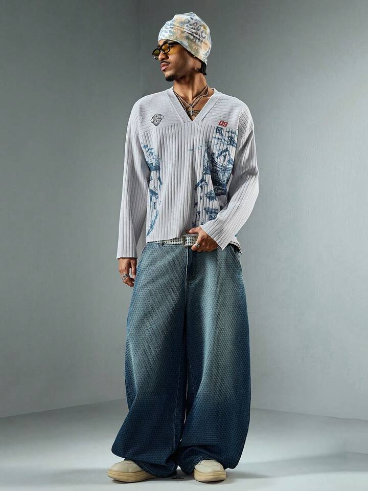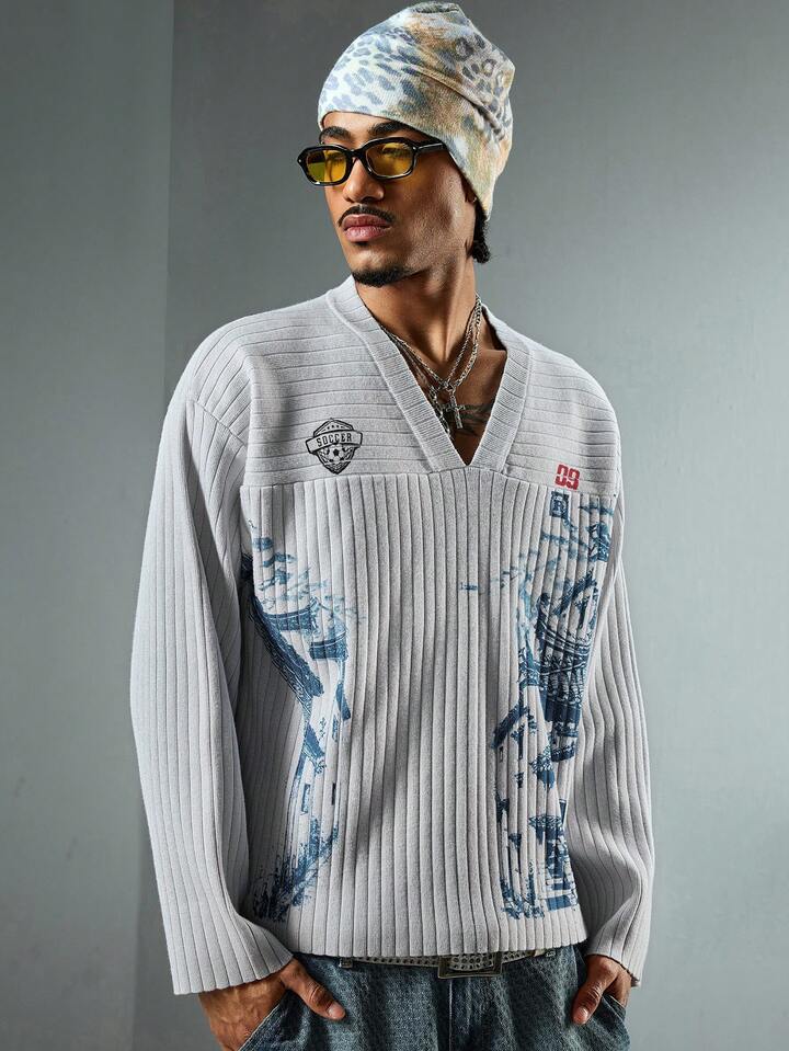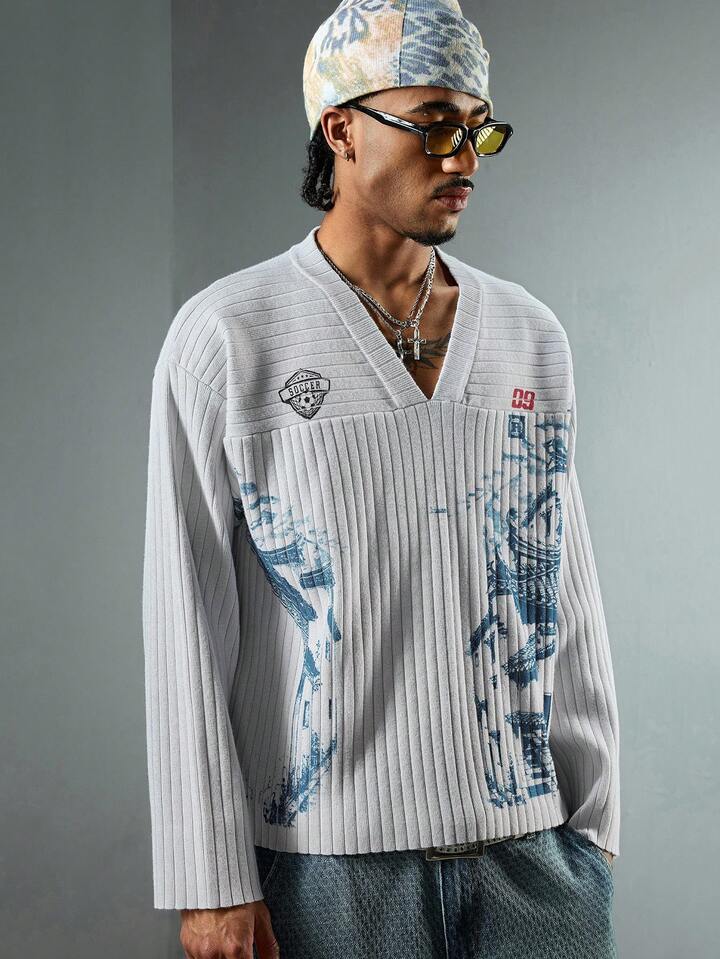 Street Life كنزة صوفية رجالية بياقة على شكل حرف V باللون الأزرق مع نمط خطوط هندسية