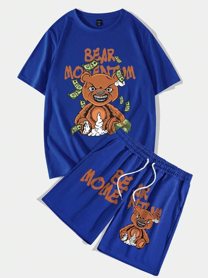Street Life طقم قميص رجالي بأكمام منسدلة و بنطلون قصير مطبوع برسوم كارتونية و حروف