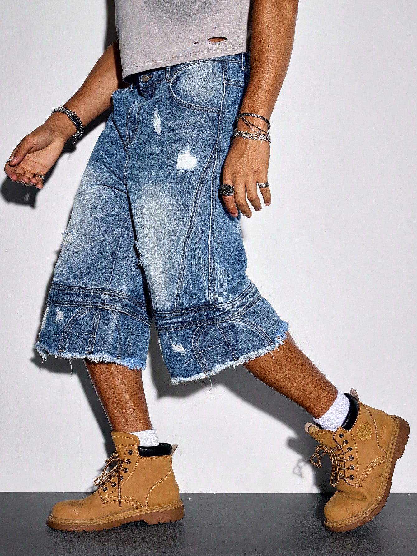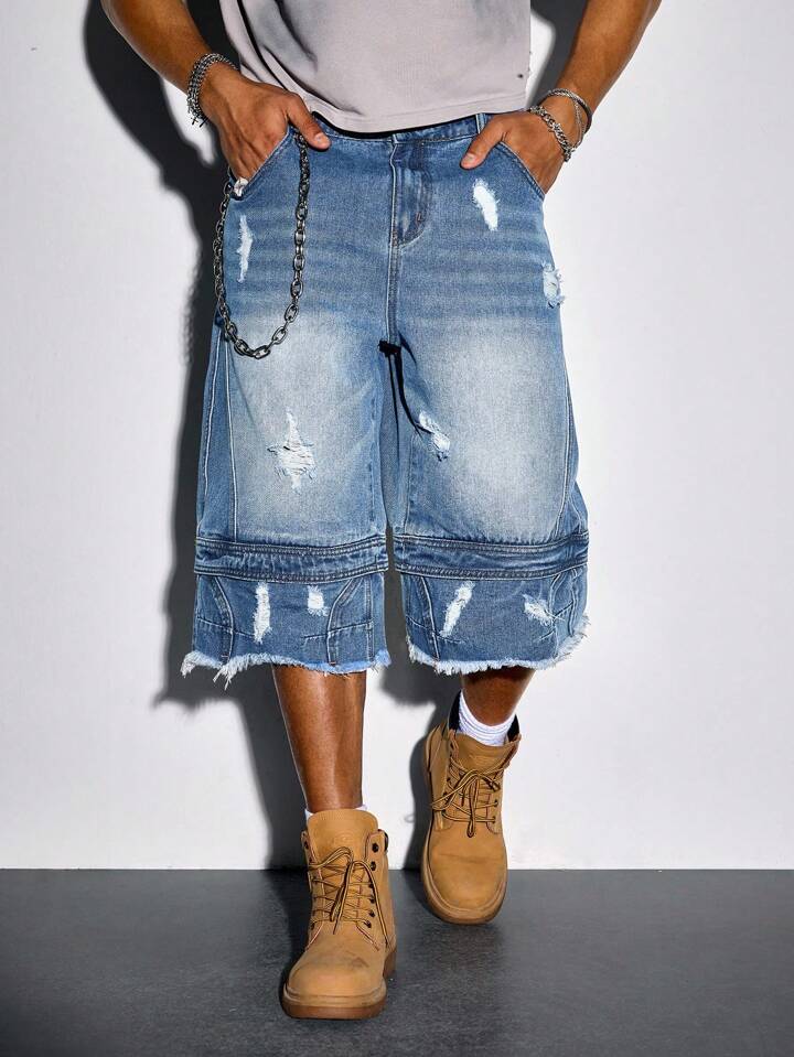 Street Life سروال قصير جينز رجالي كاجوال، منحل مشذب متحلّل الحافة