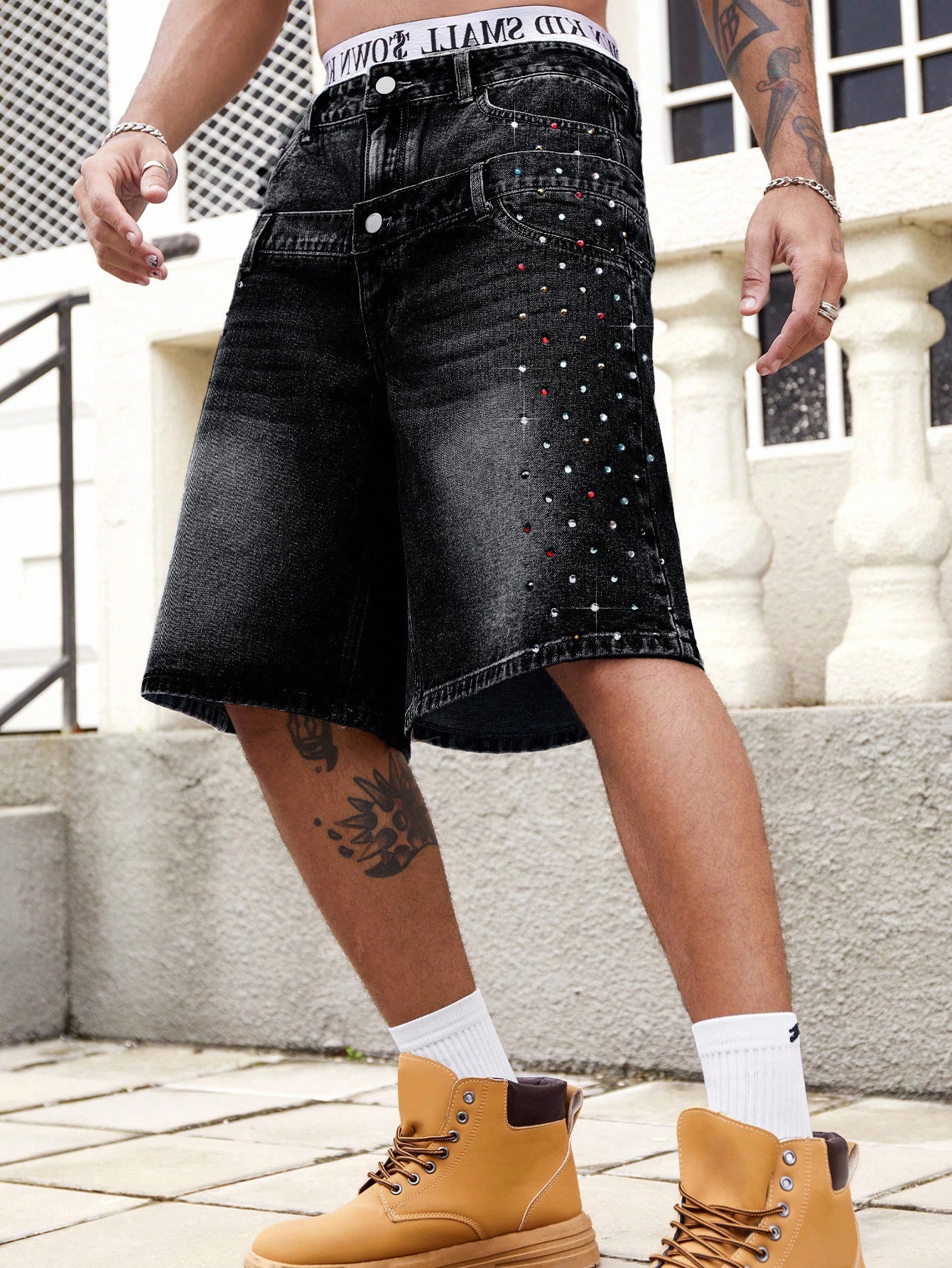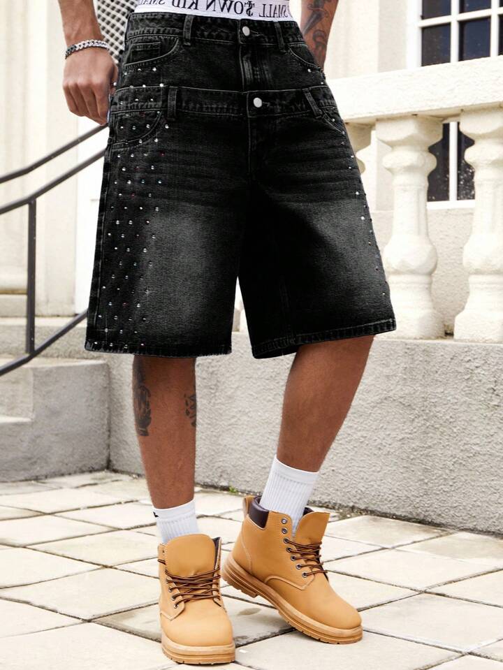 Street Life سراويل قصيرة جينز للرجال مزينة بحجارة الراين الملونة وممتدة في الخصر المزدوج