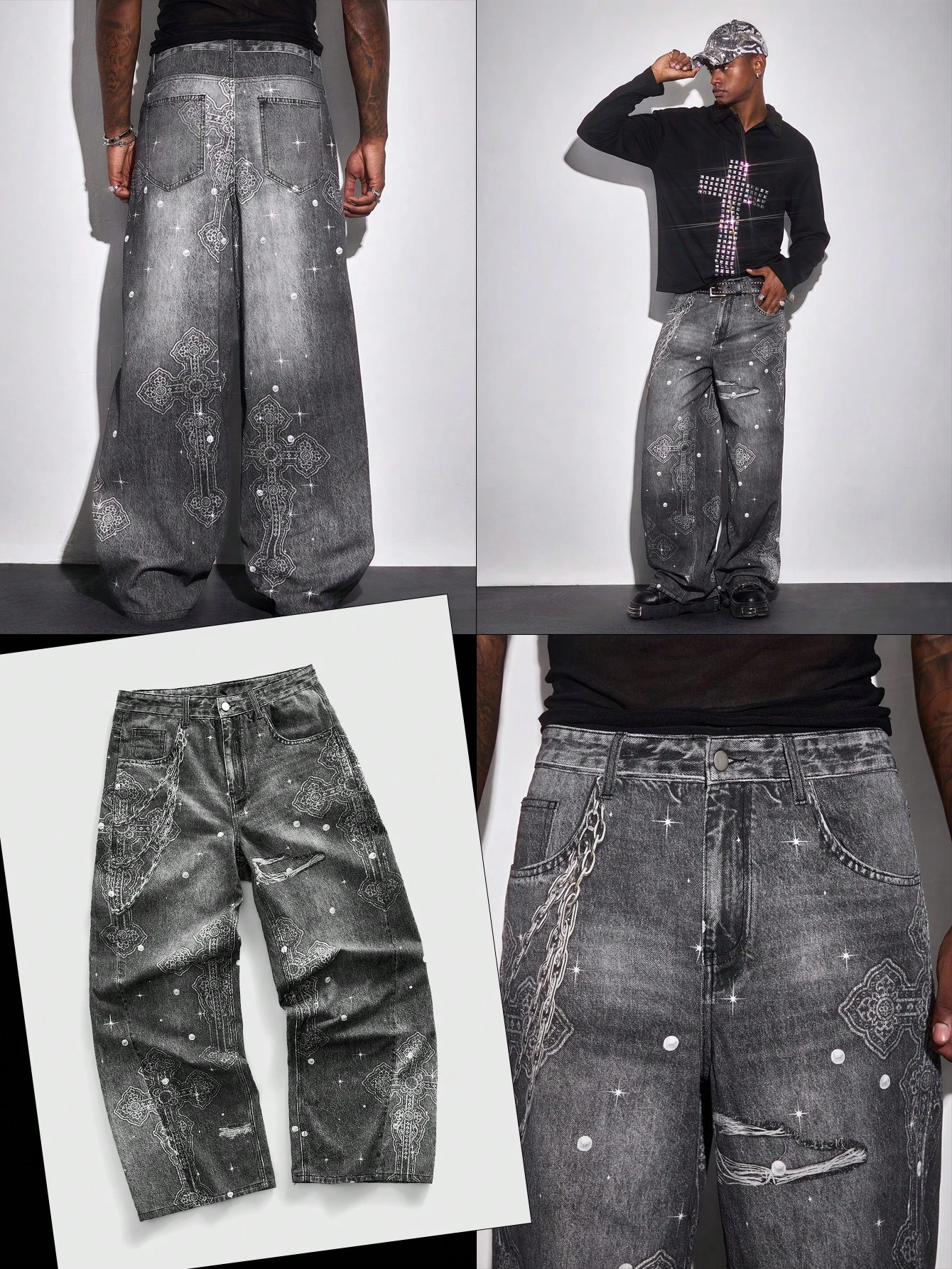 Street Life بنطلون جينز رجالي فضفاض بساق واسعة وجيب بنمط الصليب
