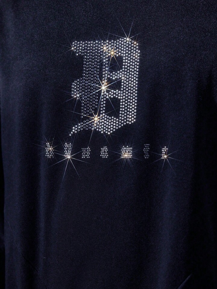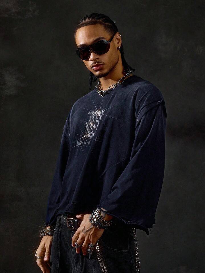 Street Life تي شيرت طويل الأكمام مطبوع بطبعة ماسية مهترئة، قصة فضفاضة مقصرة