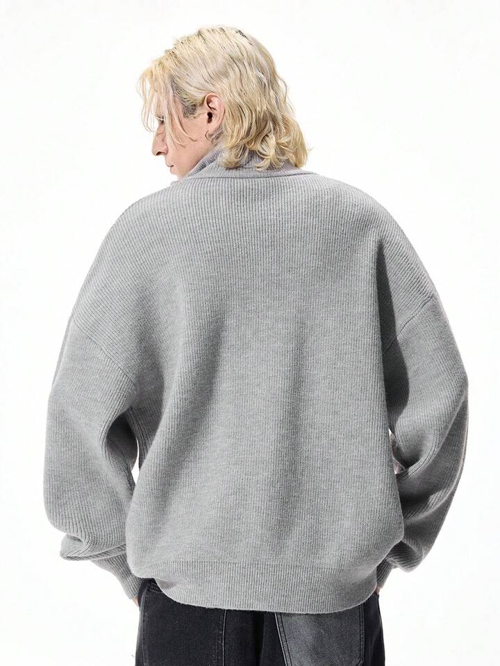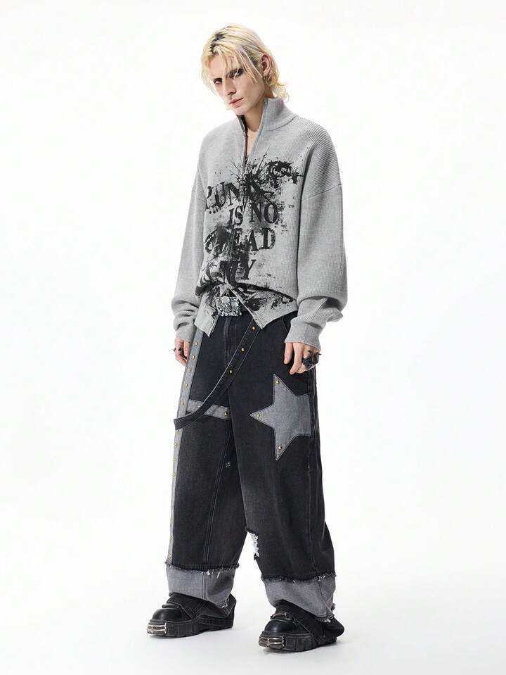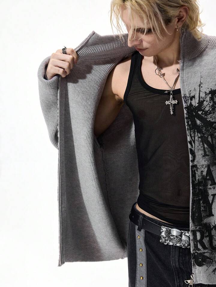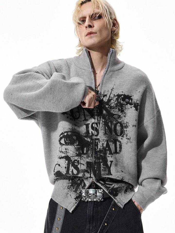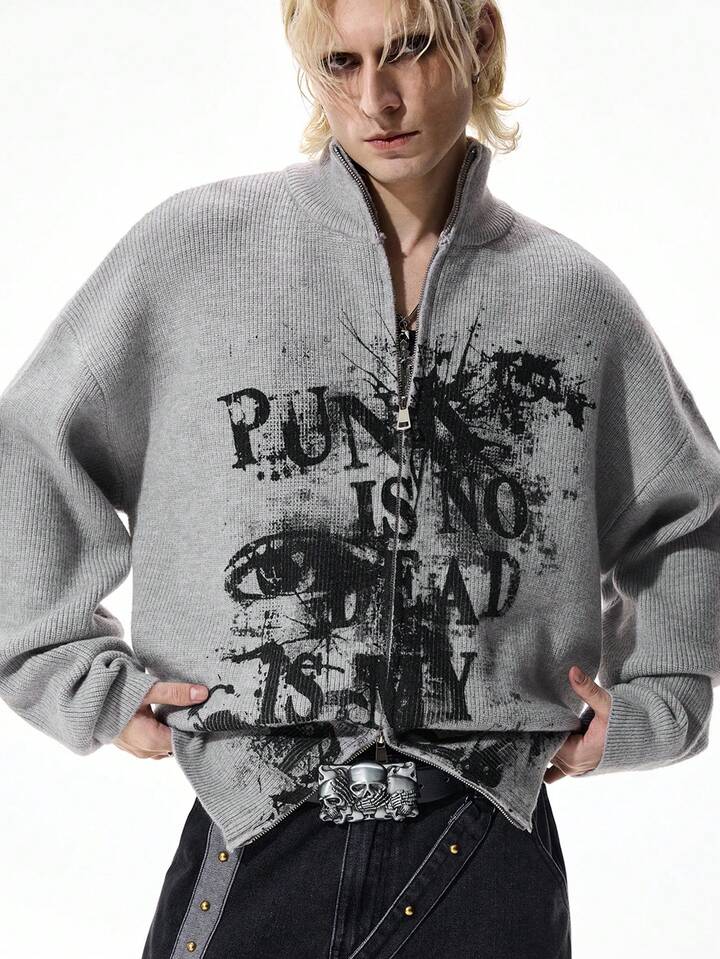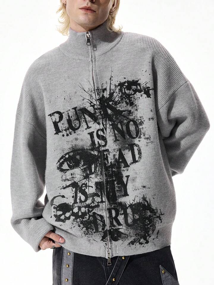 Street Life كارديجان محبوك بياقة عالية وسحاب وطباعة عين وحرف، بأكمام طويلة للرجال