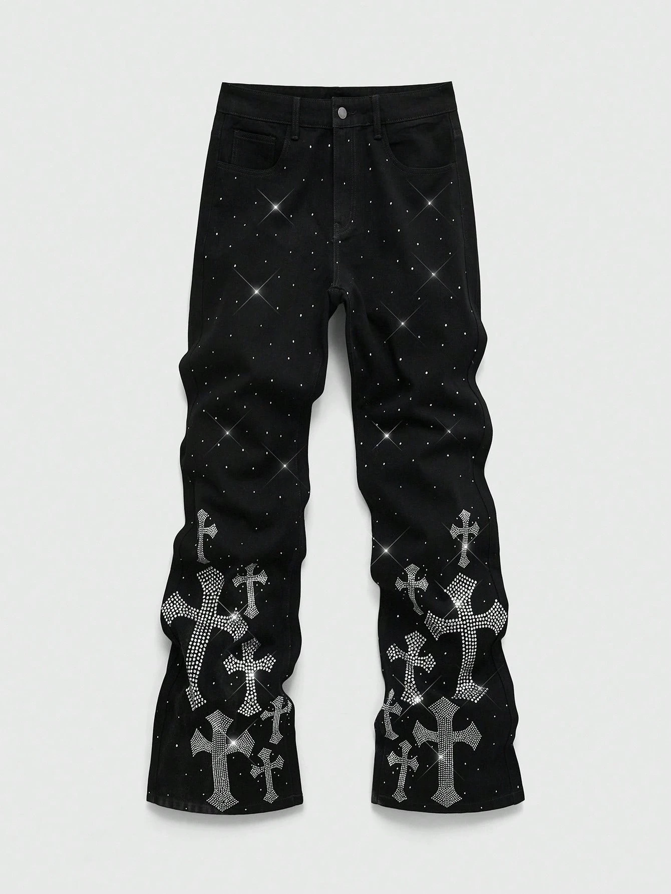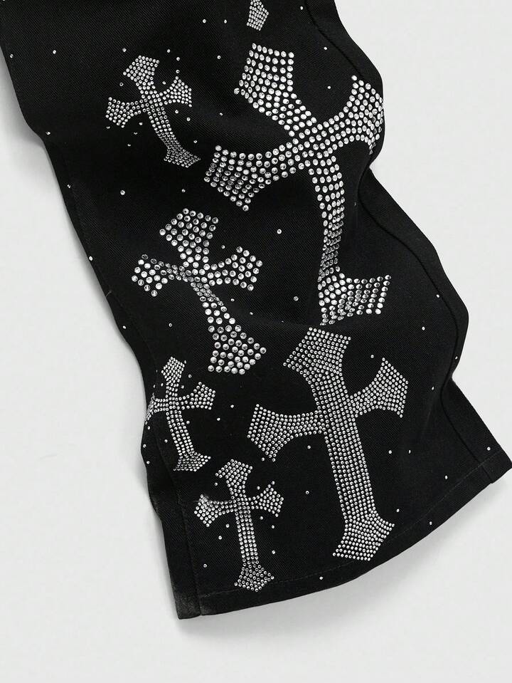 Street Life بنطلون جينز رجالي بجيب مائل مزين برسم صليب من الراين، بطراز الشارع الأنيق