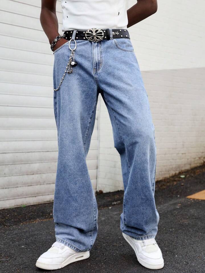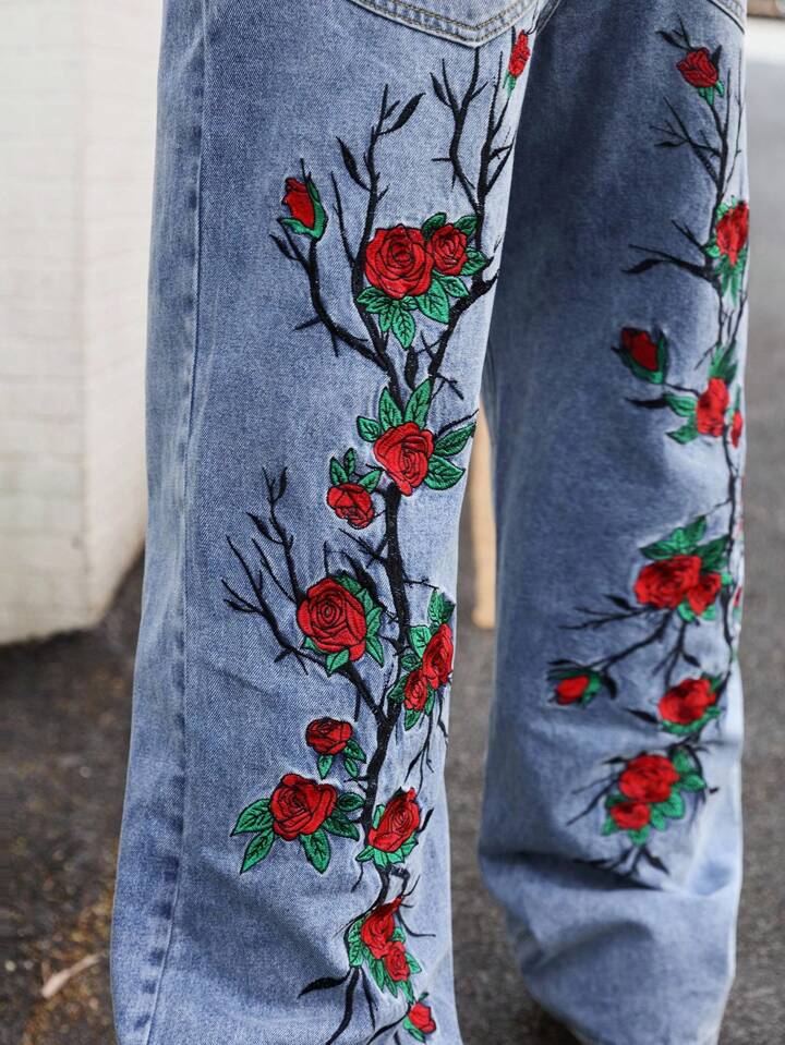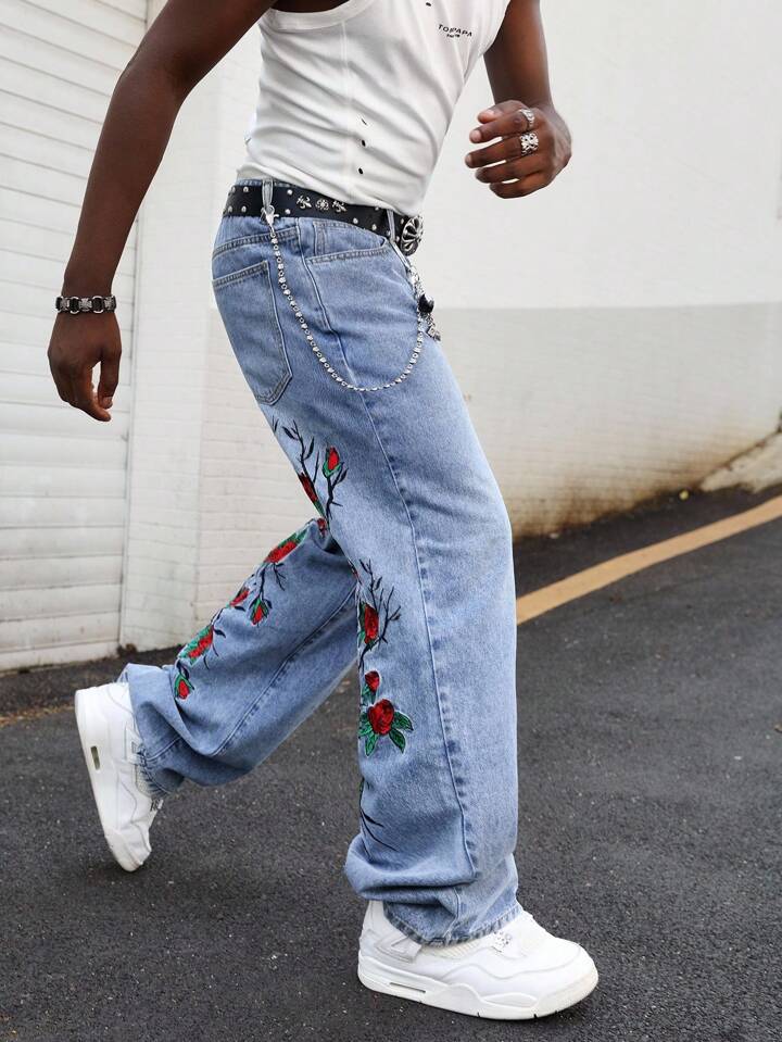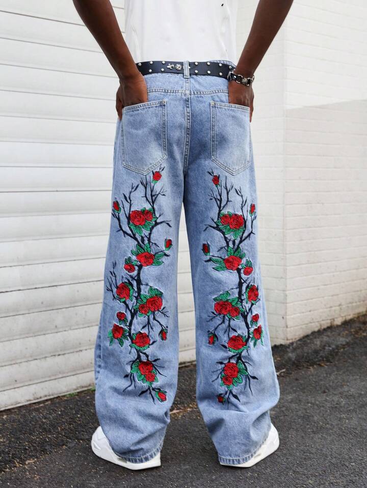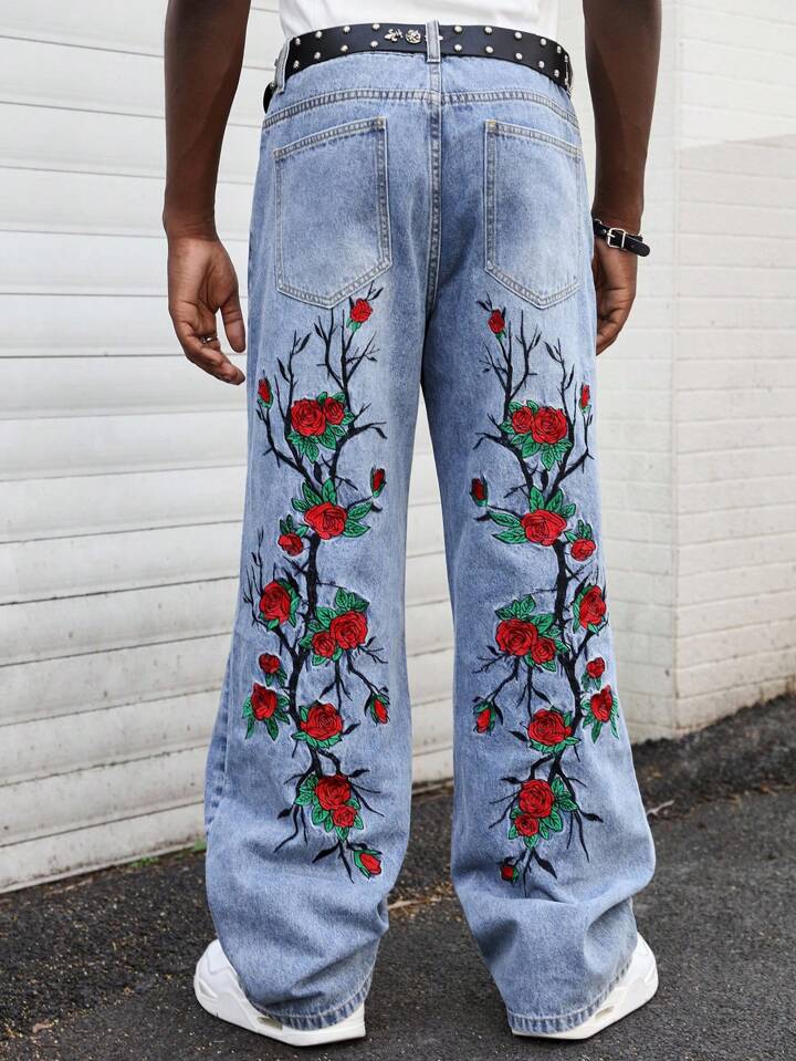 Street Life سراويل جينز كاجوال مطرزة بالزهور أنيقة مع جيوب للرجال