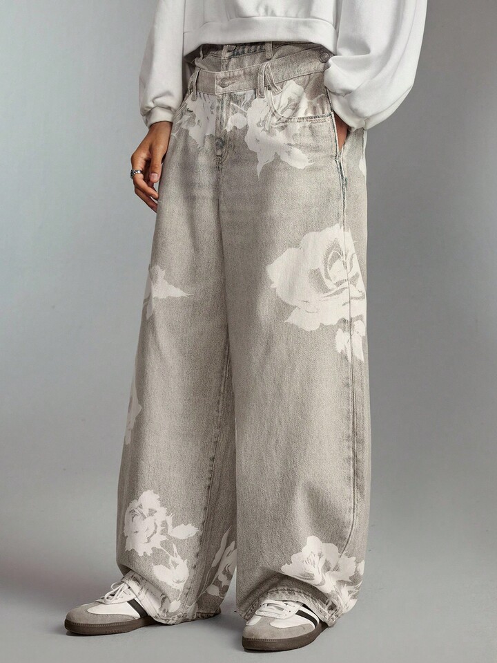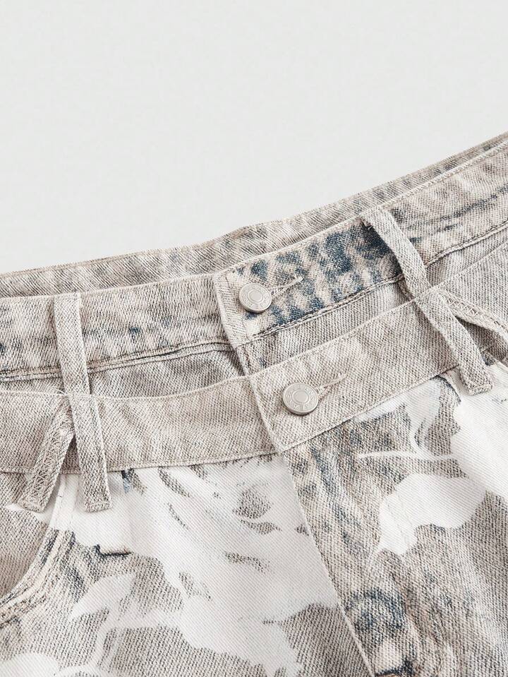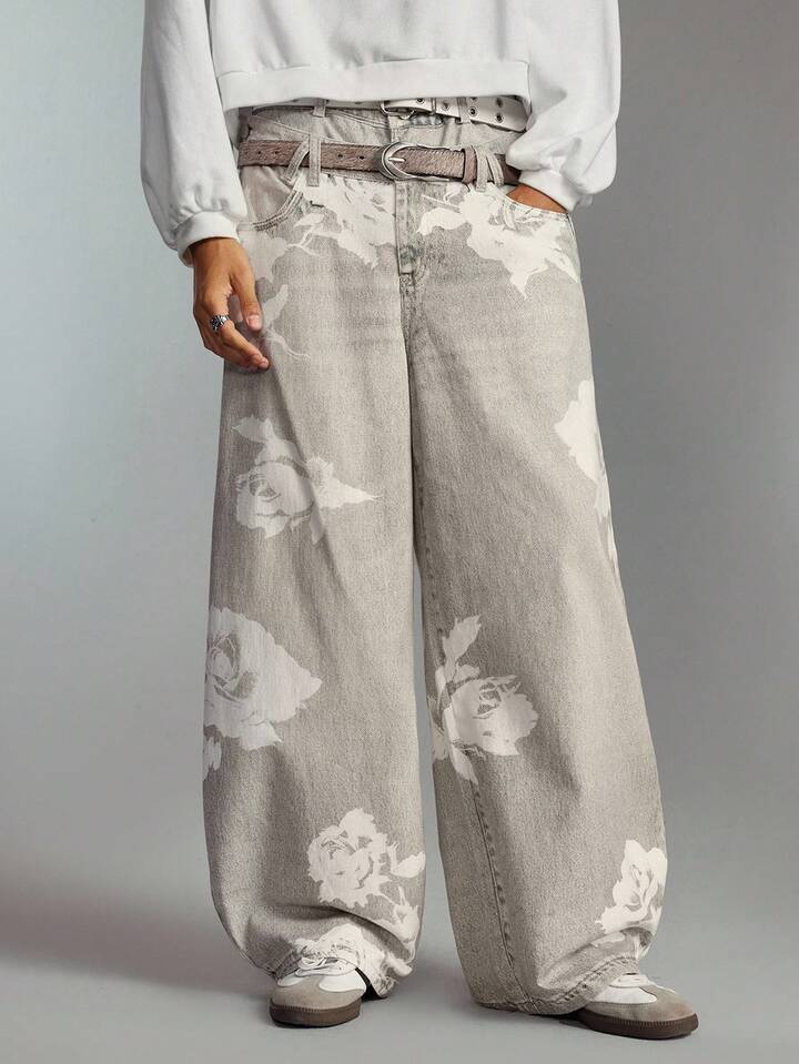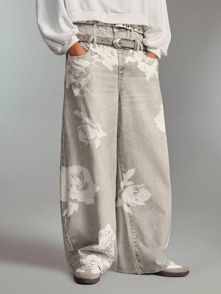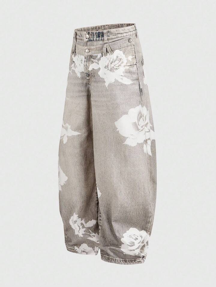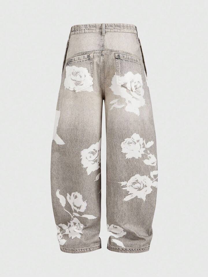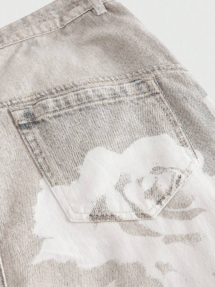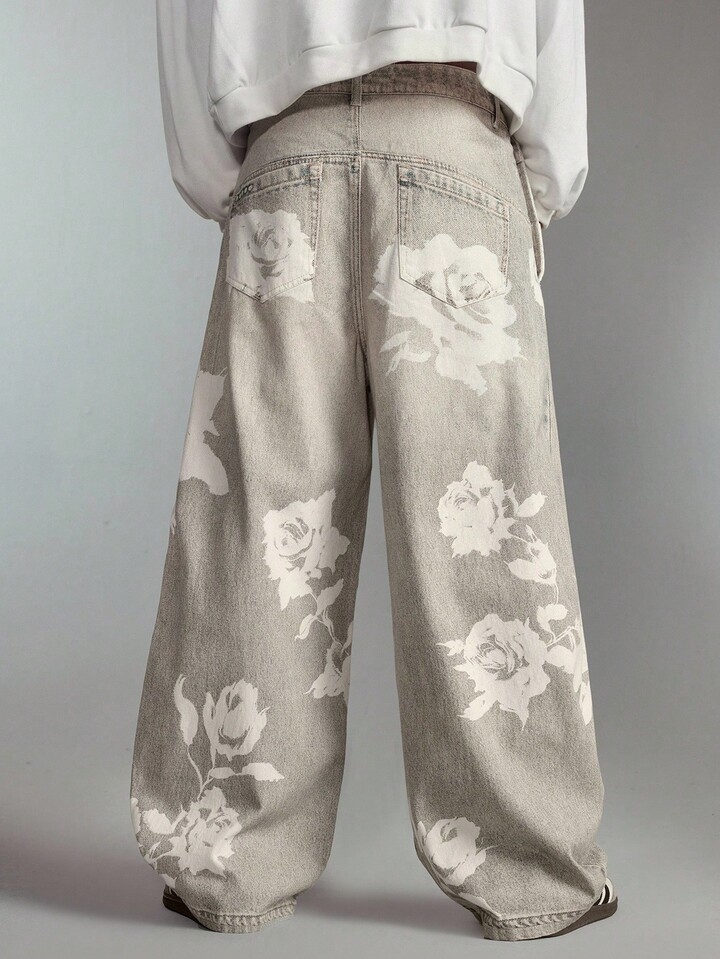 Street Life بنطلون جينز رجالي فضفاض بقصة واسعة مع جيب مطبوع بنقشة الزهور