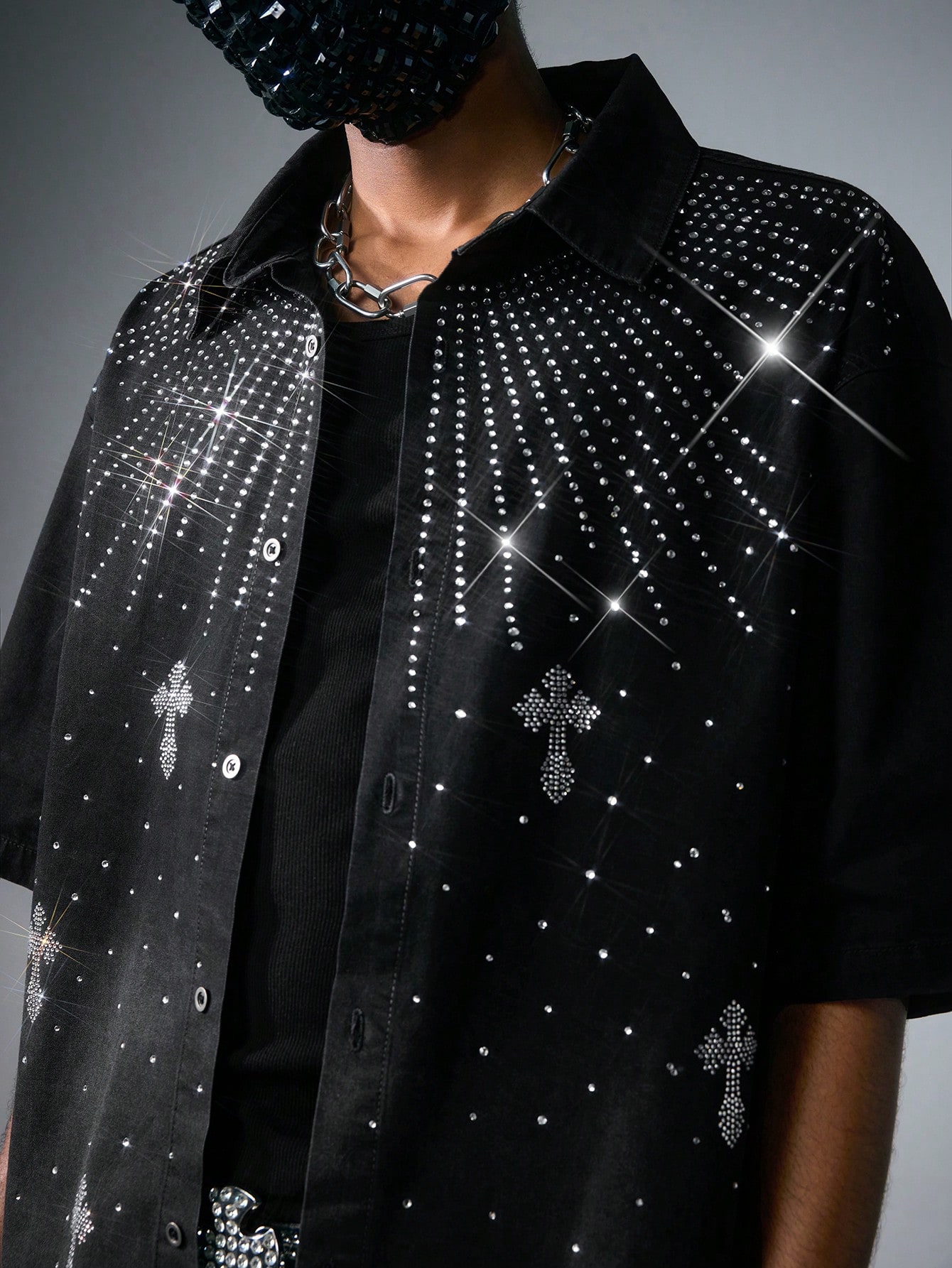 Street Life قميص جينز رجالي بتزيين صليب من الراين ستون، طراز جوث، عيد الهالوين