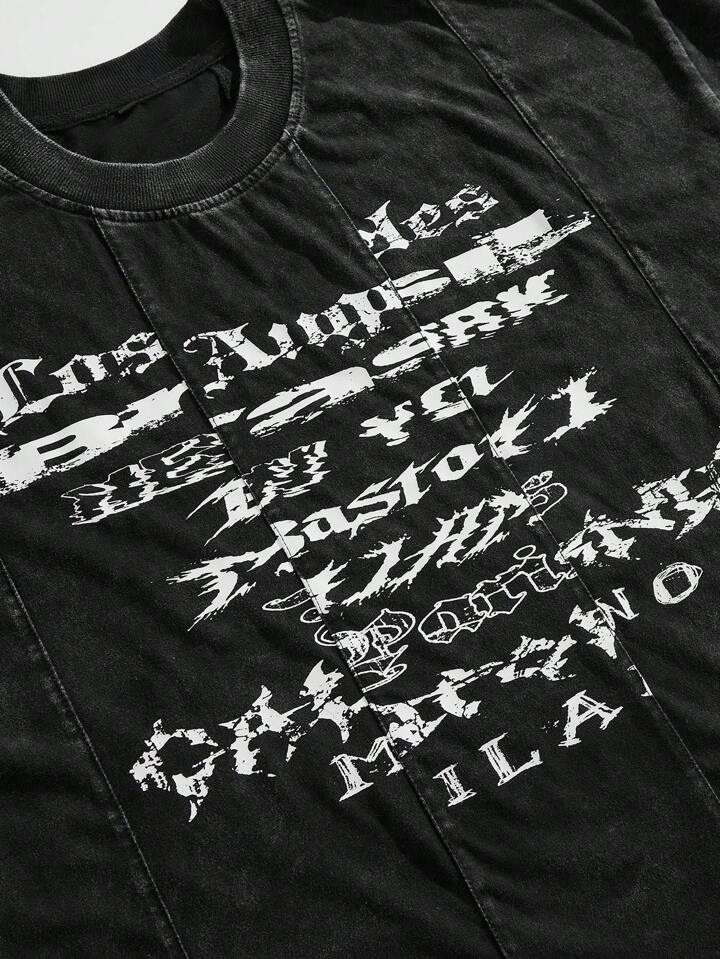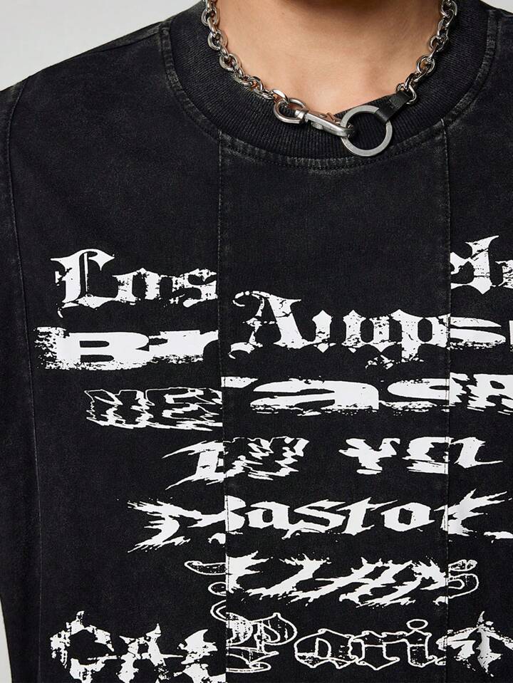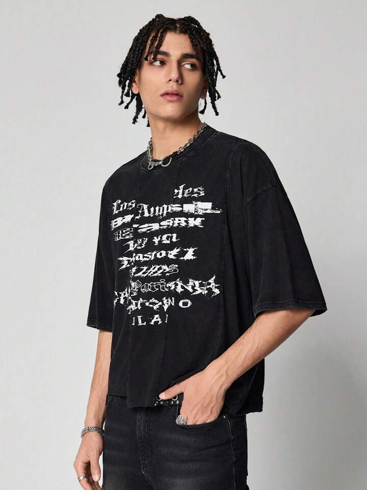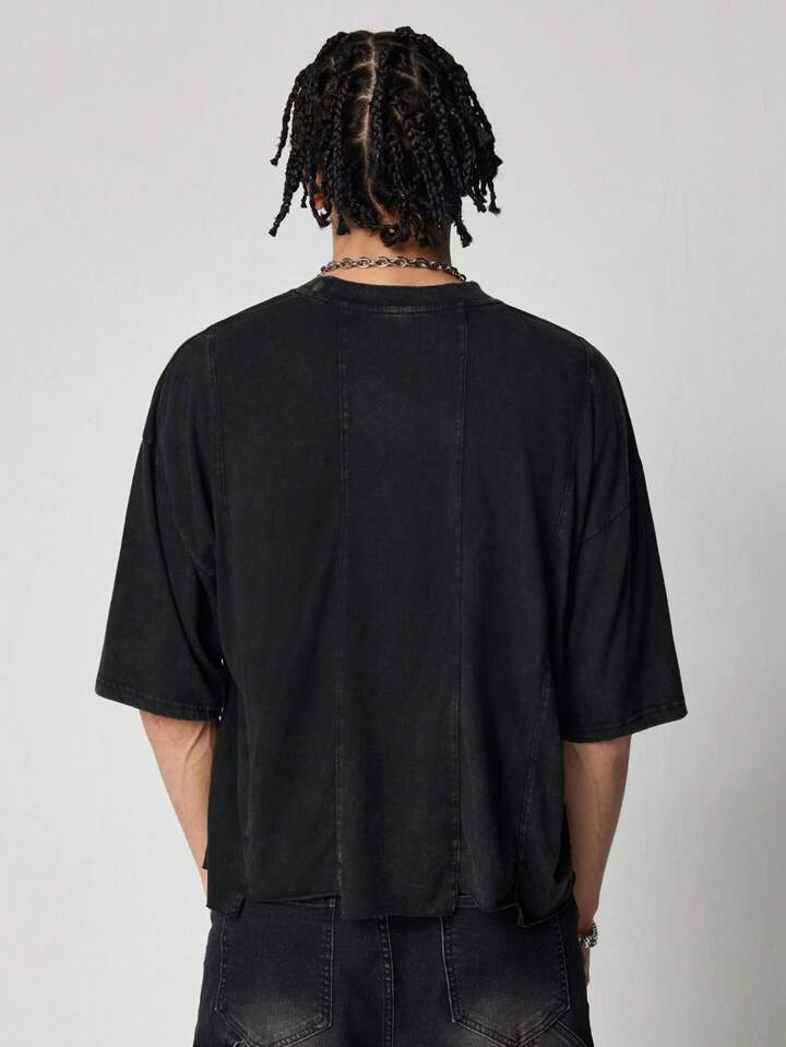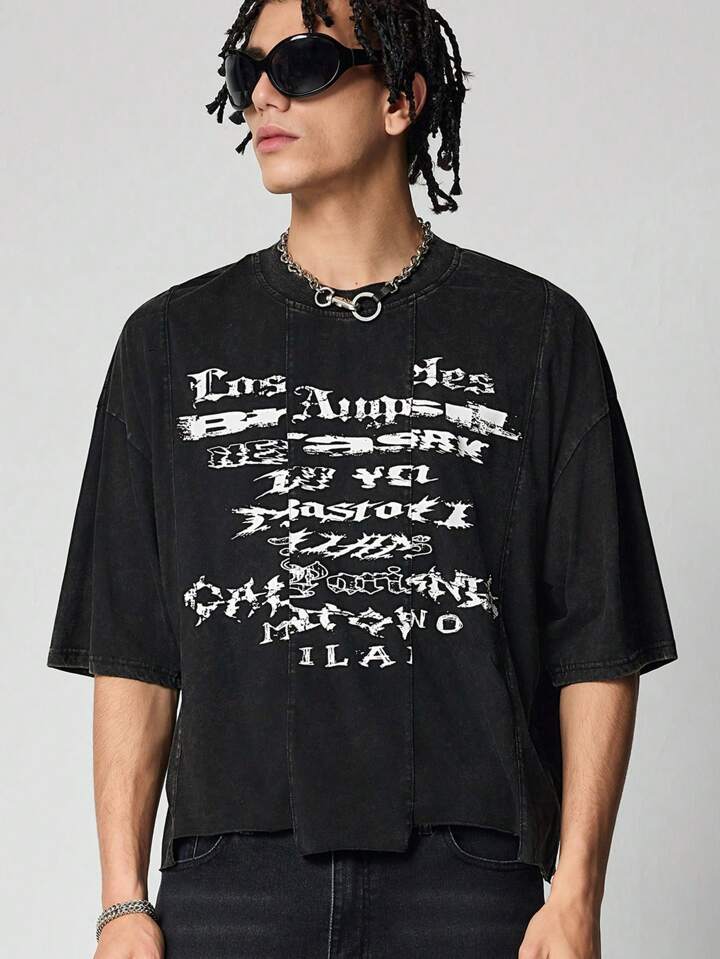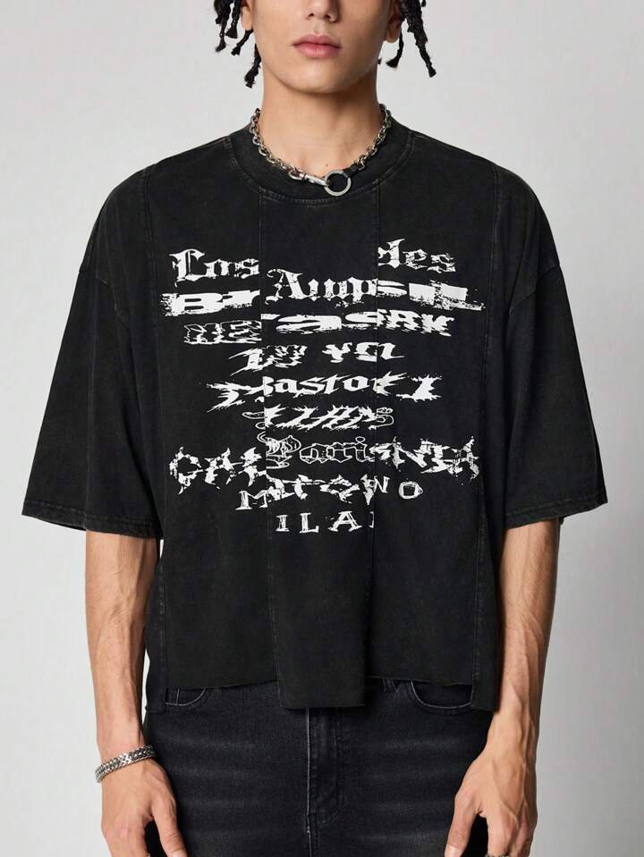 Street Life تي شيرت تي شيرت رجالي بطباعة شعار غير متماثلة ومرقّع مُصبوغ، قالب مربع