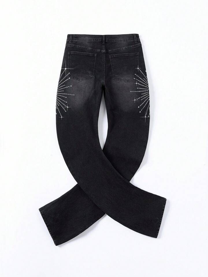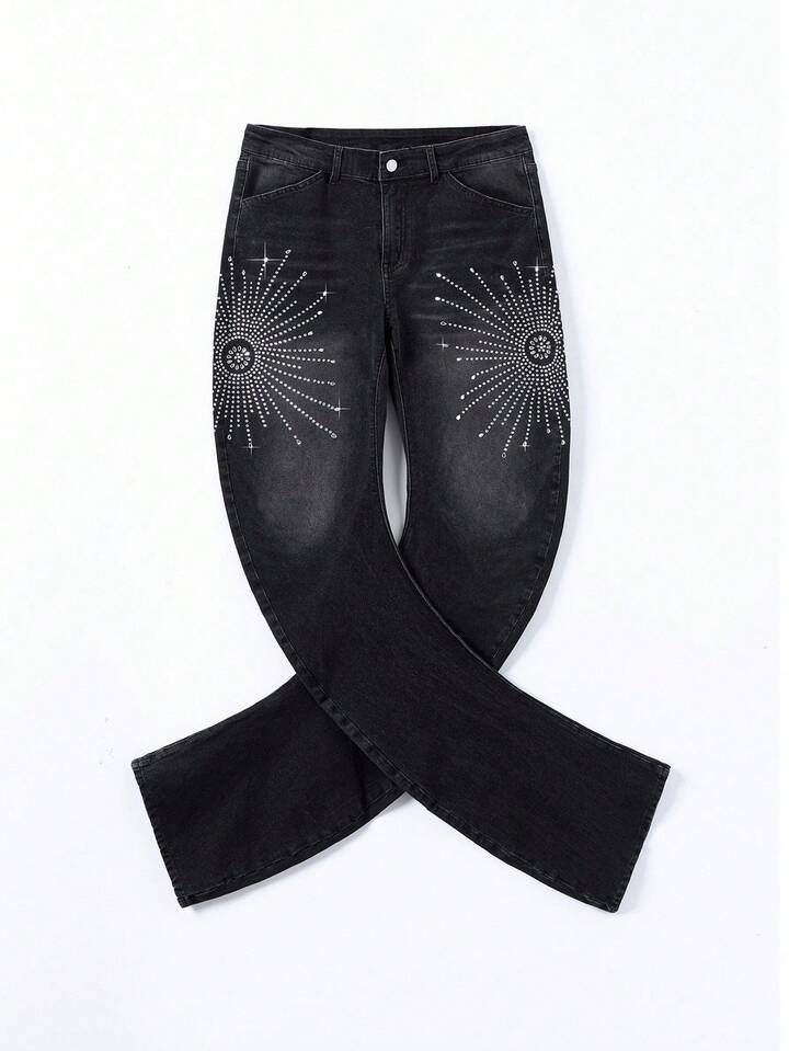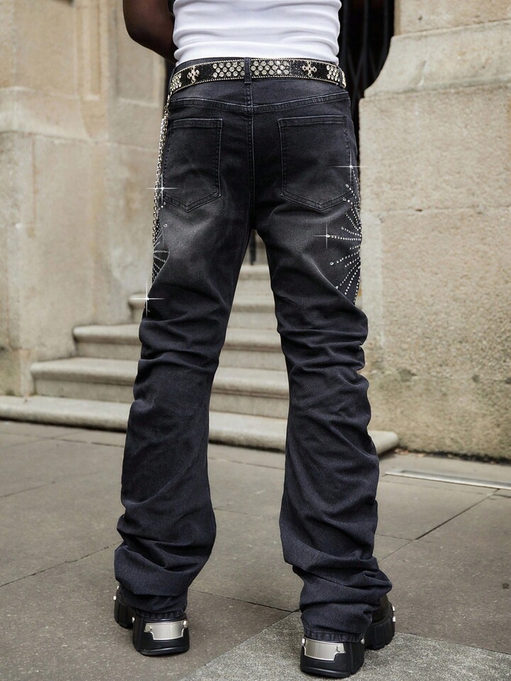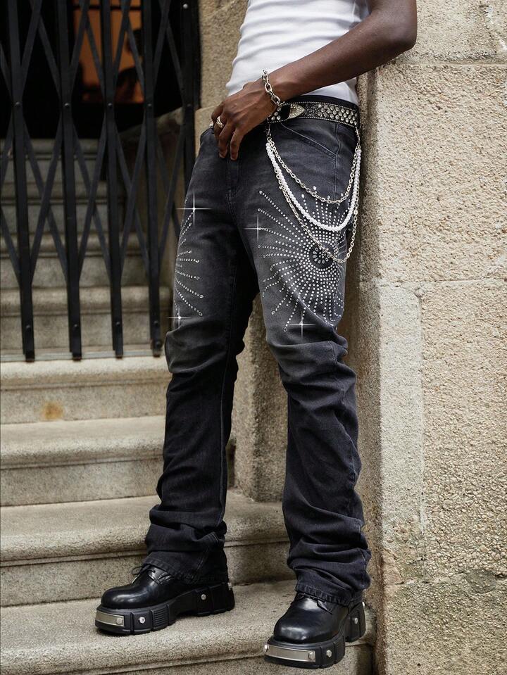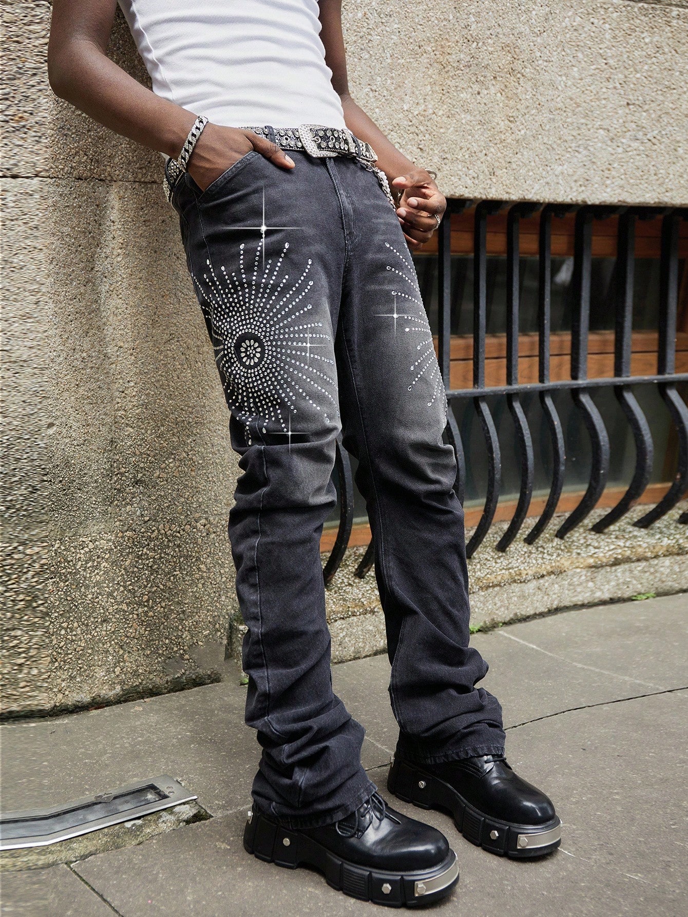 Street Life بنطلون جينز رجالي ثقيل الوزن مطرز بألماس مغسول بطبقات منحنية