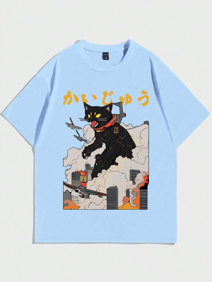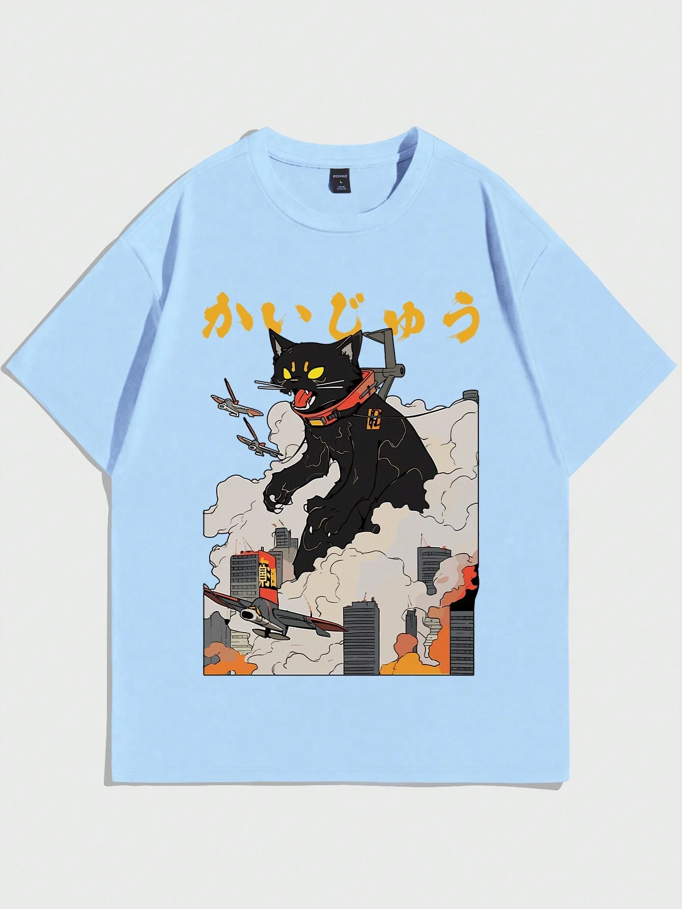 Street Life تي شيرت رجالي بأكمام قصيرة مطبوع عليها حرف وقطة