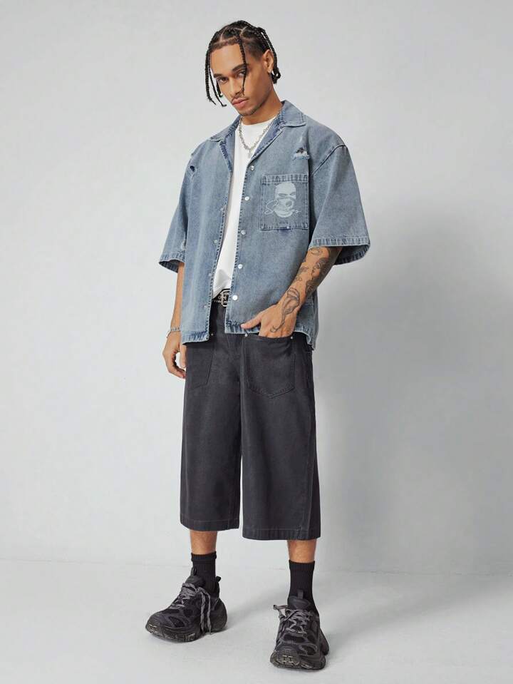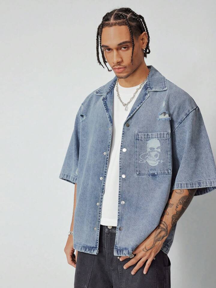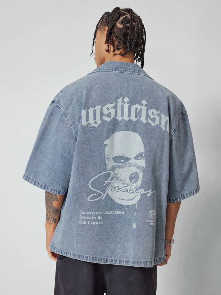 Street Life قميص جينز كاجوال فضفاض قصير الأكمام بطباعة رموز حرفية للرجال