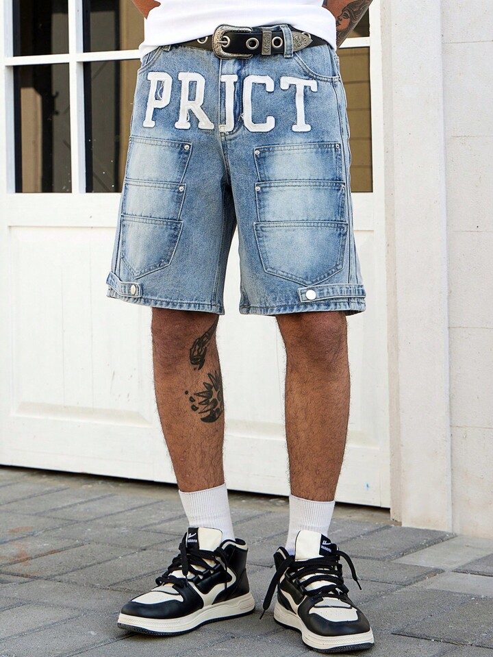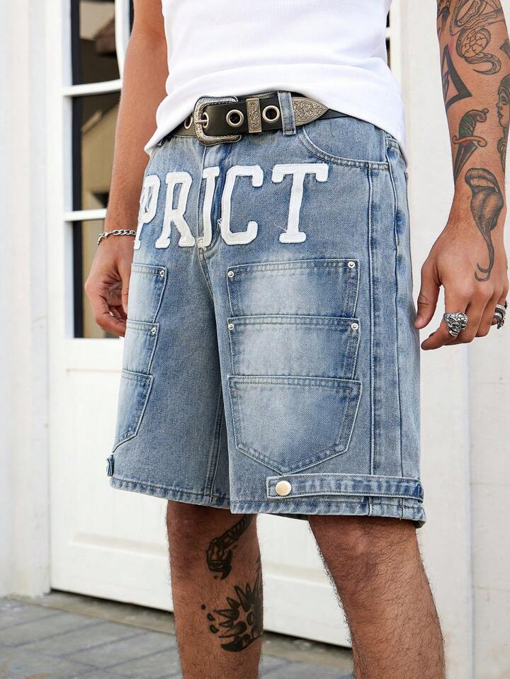 Street Life شورتات جينز للرجال مطرزة بخطوط كتابية متعددة الجيوب
