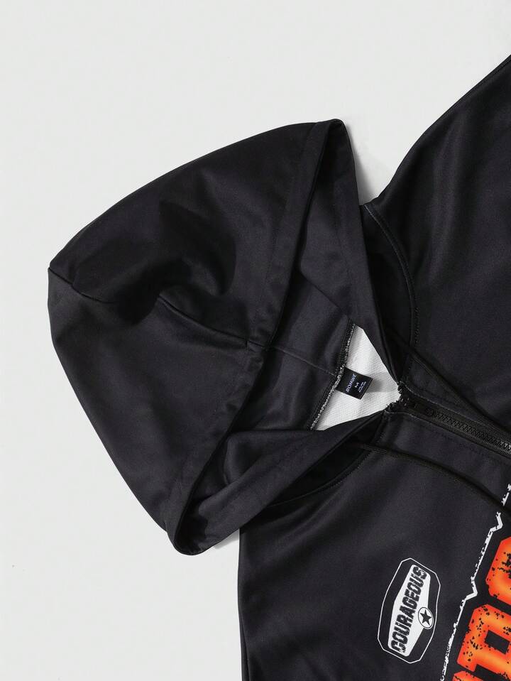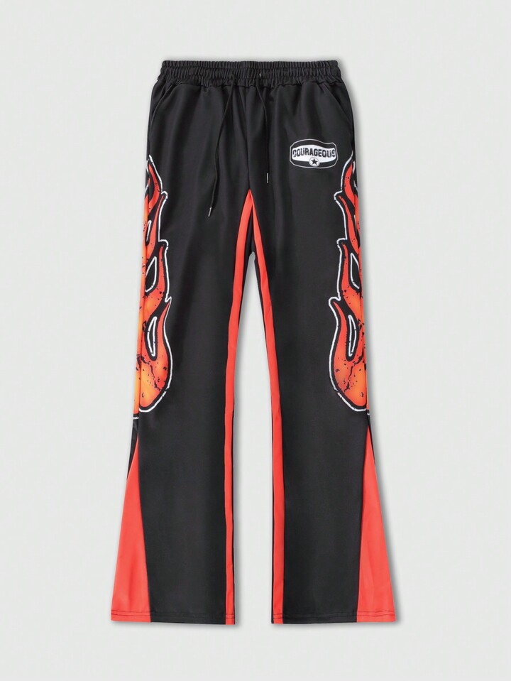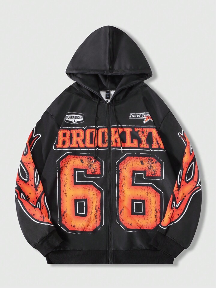 Street Life مجموعة بلوزة هودي للرجال مزينة بطباعة الحرف والشعلة مع سحّاب وبنطال رياضي بساق واسعة، مجموعة ملابس كاجوال