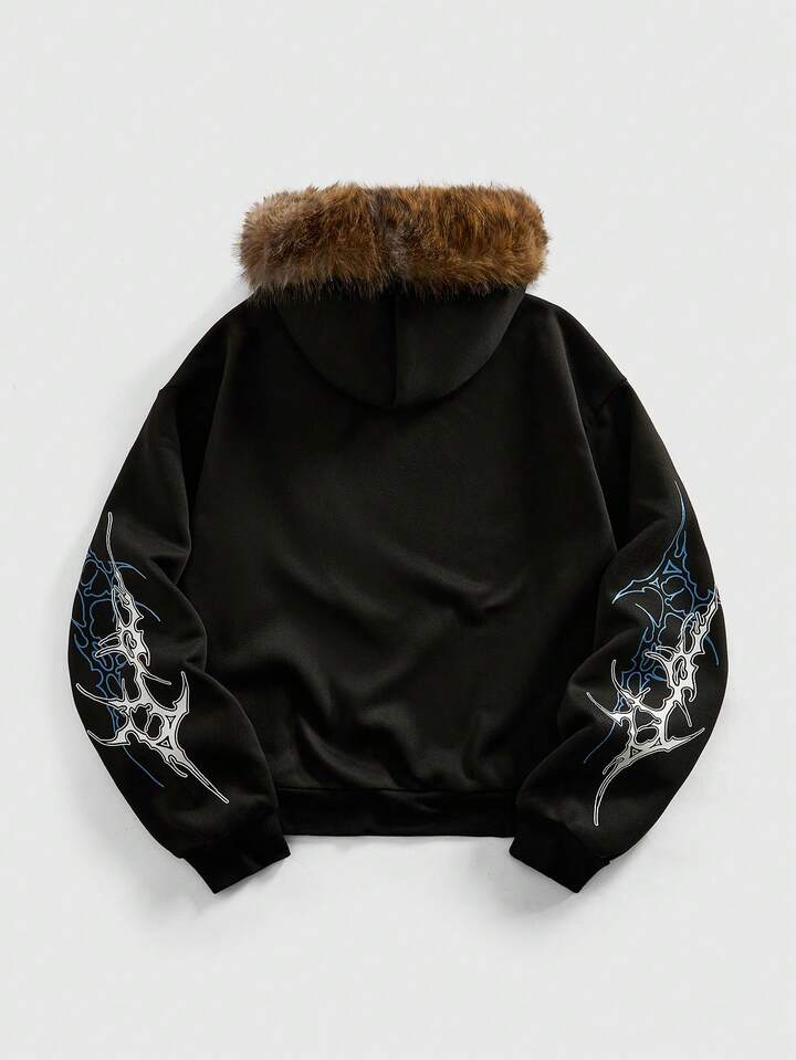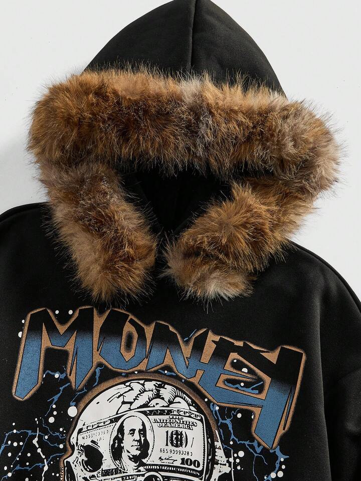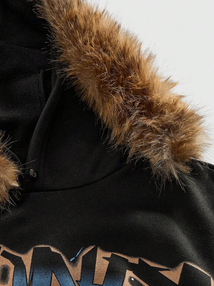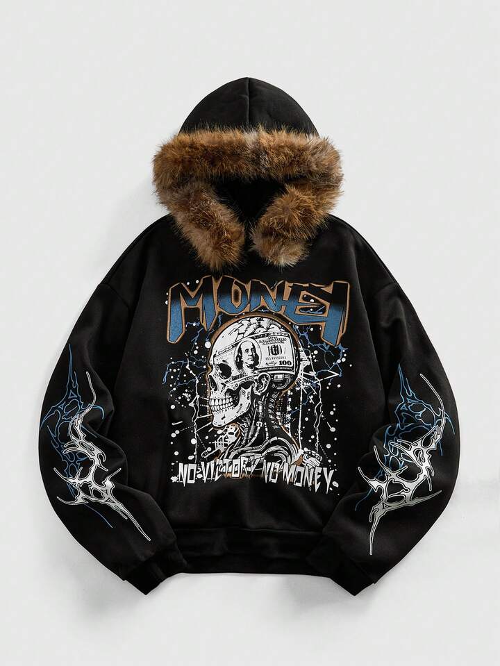 Street Life بلوزة رجالية بغطاء رأس مطبوع عليها حرف وجمجمة بأكمام طويلة وياقة من الفرو، كاجوال للخريف/الشتاء