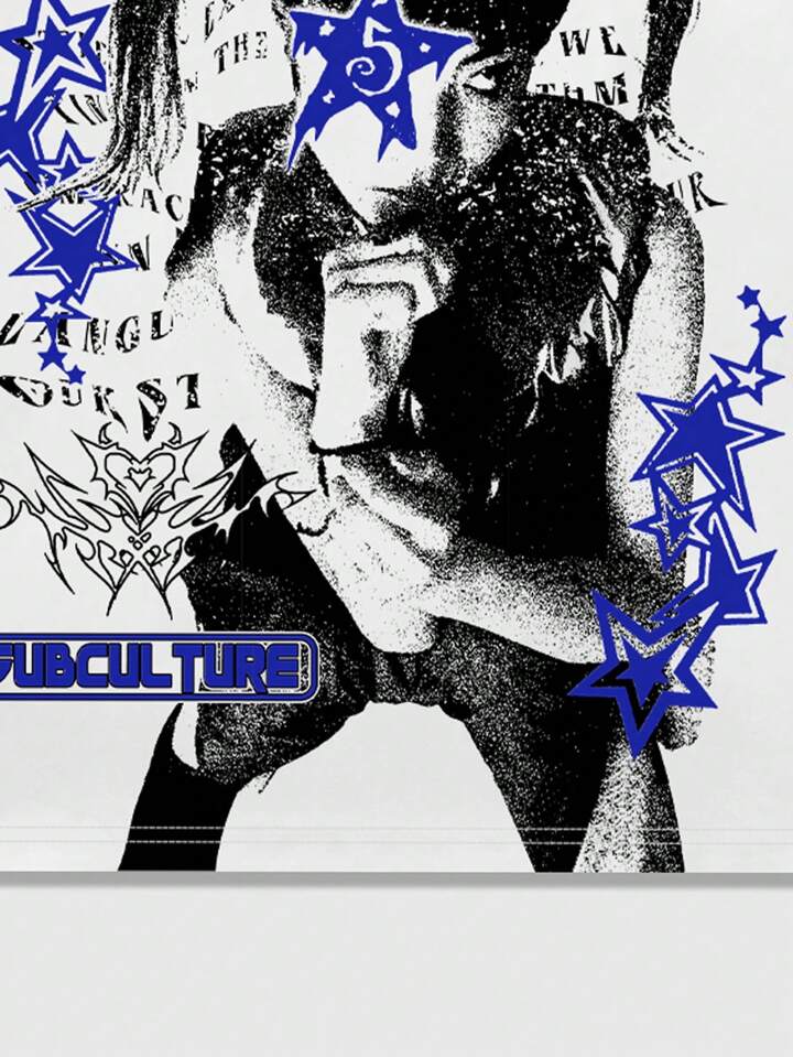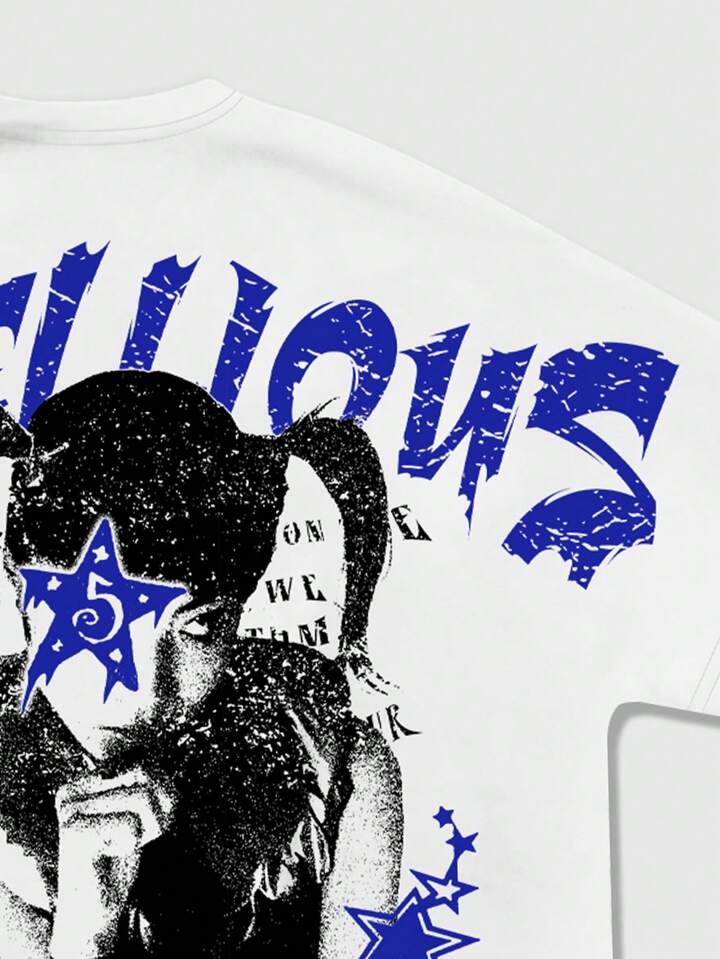 Street Life تي شيرت أبيض مع طباعة شعار وشكل ملابس الشارع مواسم، مقاس واسع مع كتف منخفض للرجال