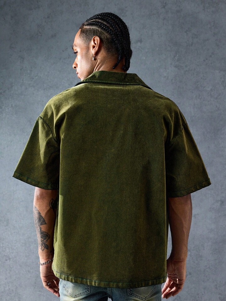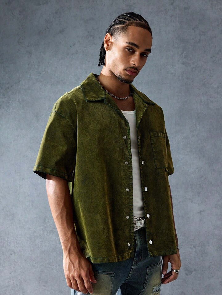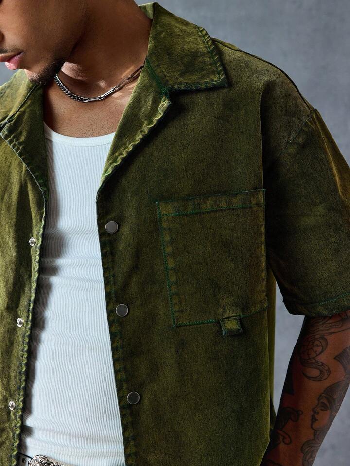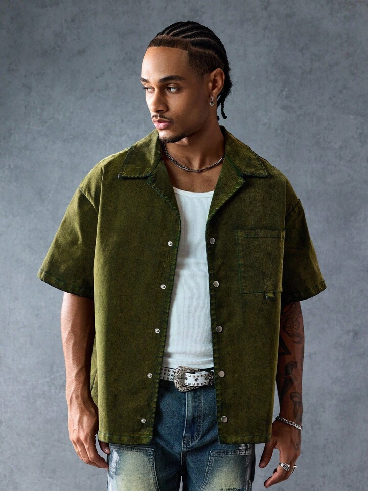 Street Life قميص جينز قصير الأكمام بجيب أحادي الصدر وياقة راقصة للرجال