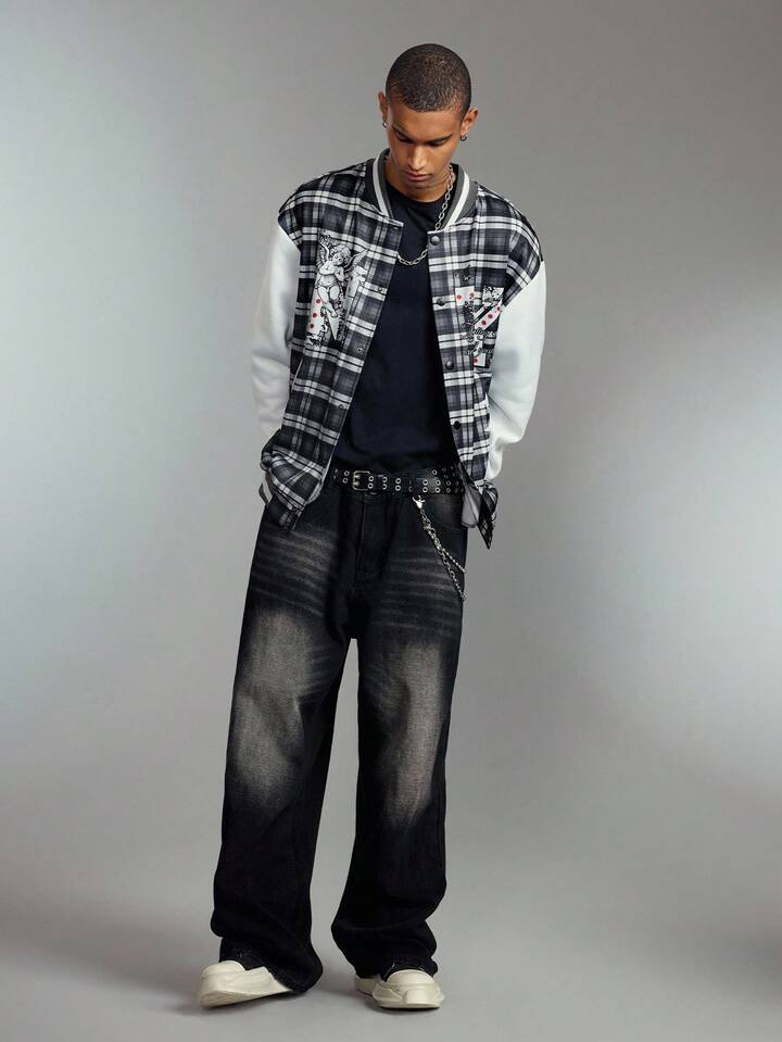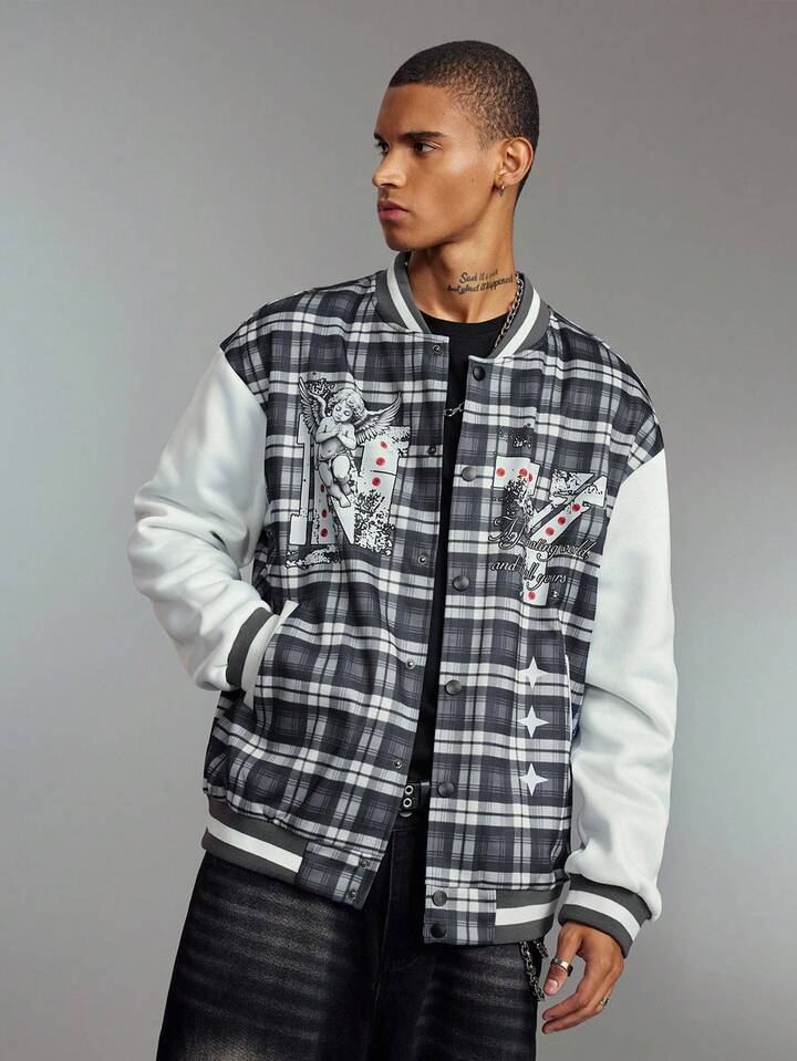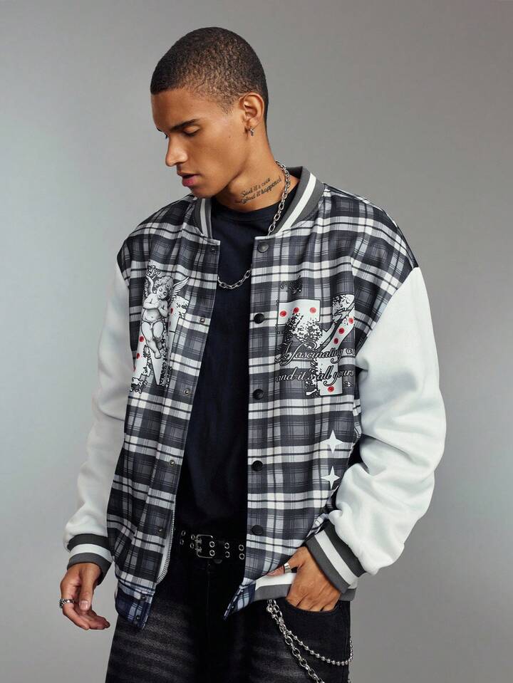 Street Life جاكيت بيسبول كاجوال متعددة الاستخدامات مع أزرار أمامية وتصميم رقعات مربعات للرجال، خريف