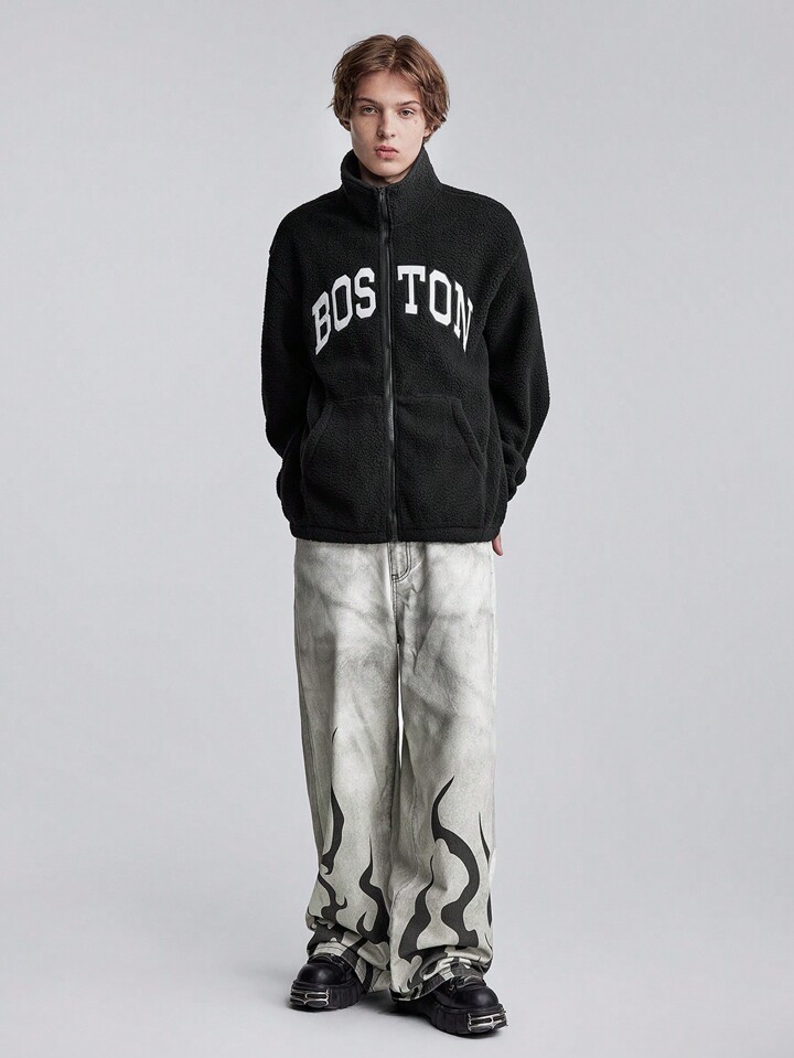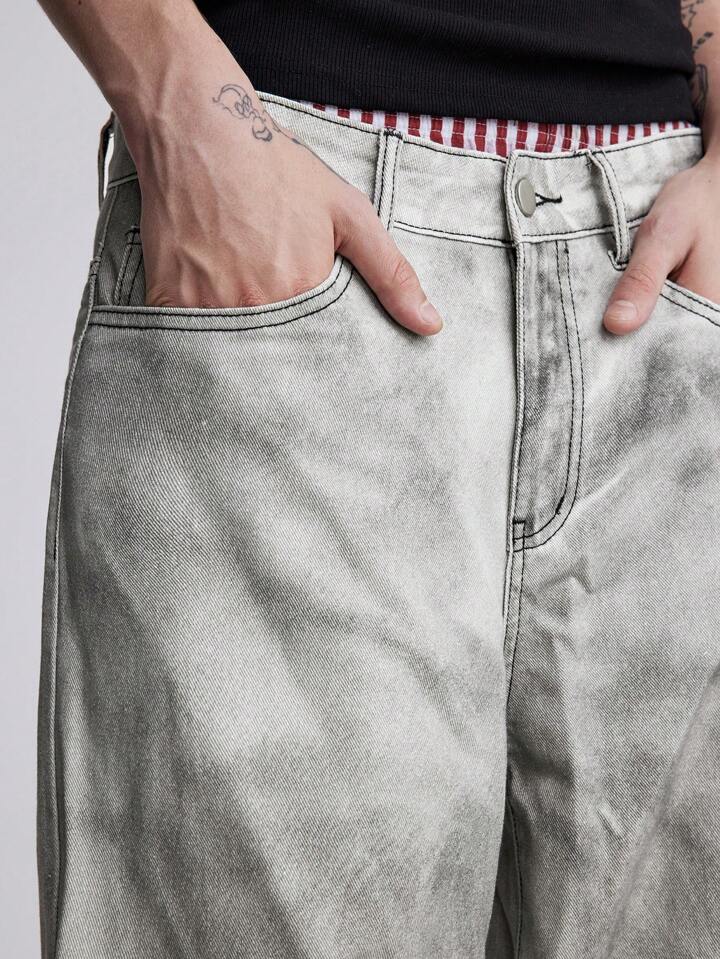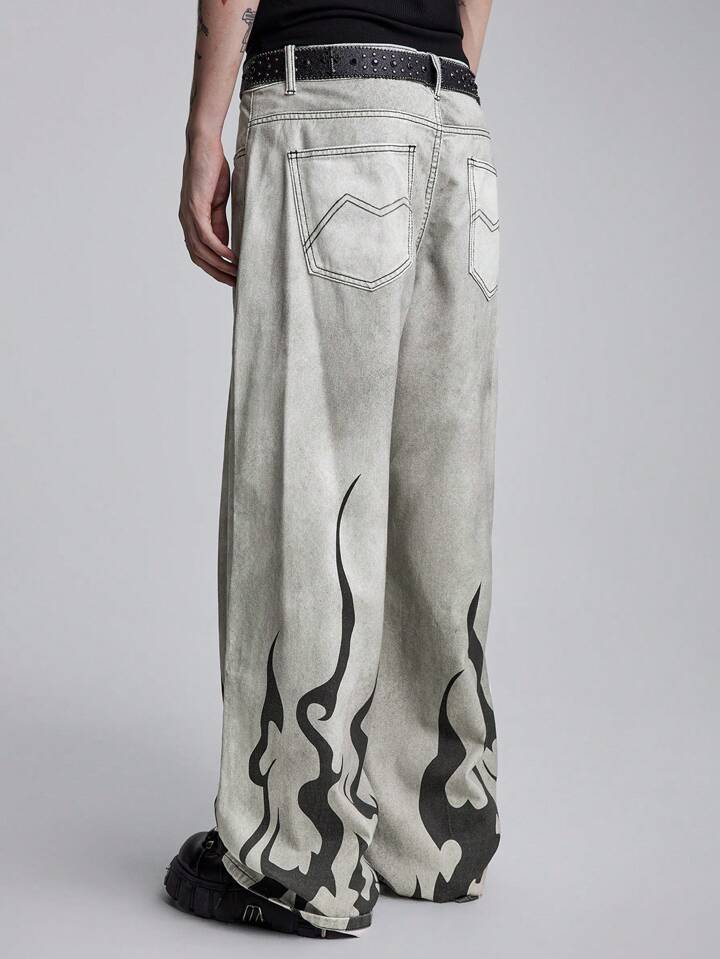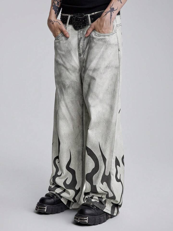 Street Life بناطيل جينز رجالي غير رسمي بطبعة شعلة، قصة ضيقة متسخة، واسع