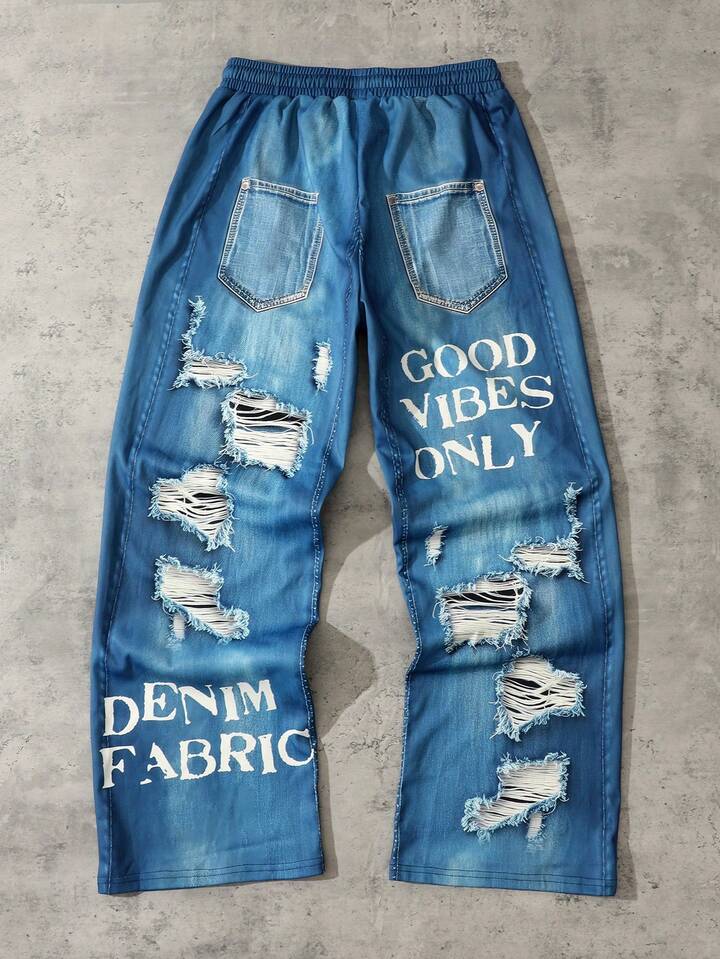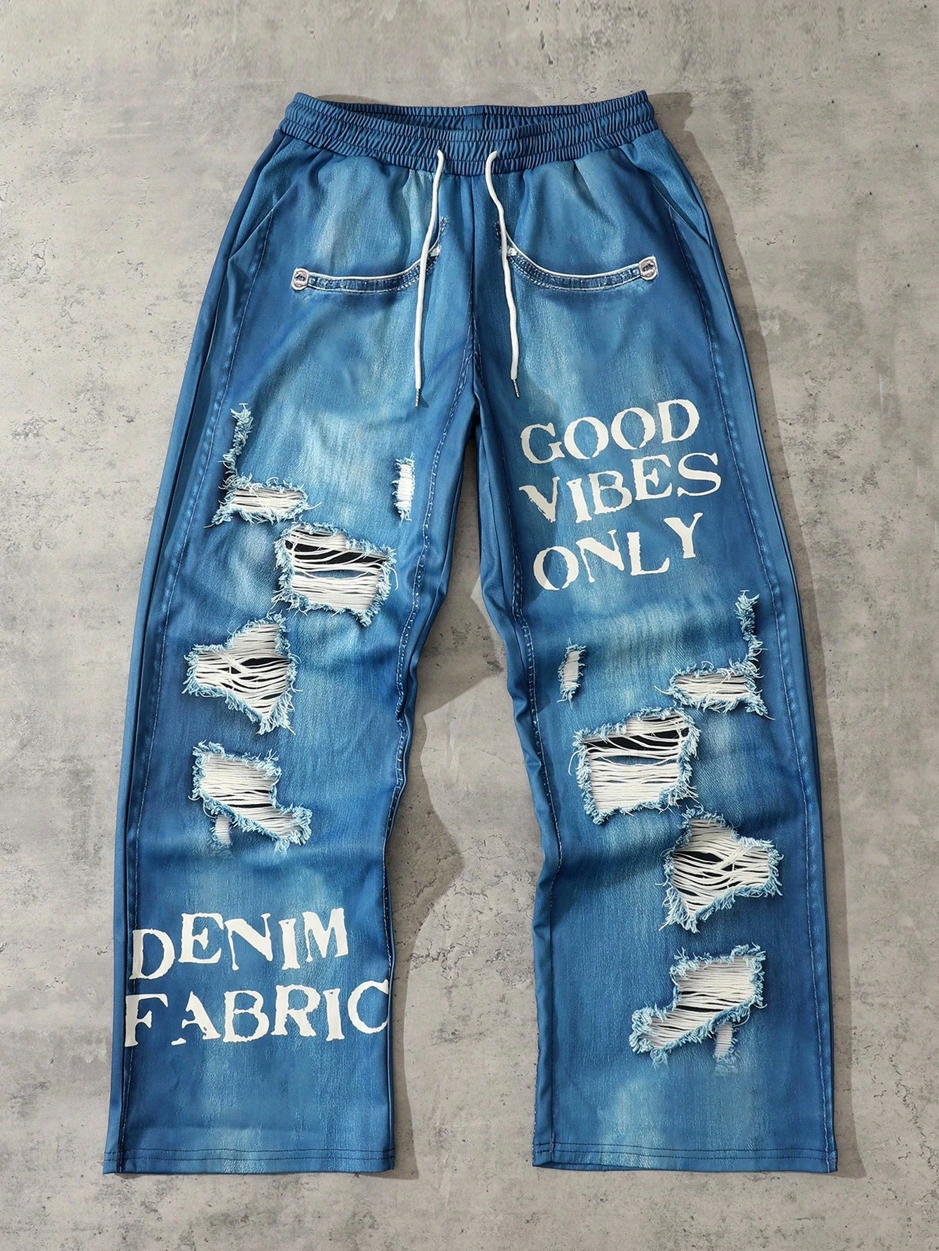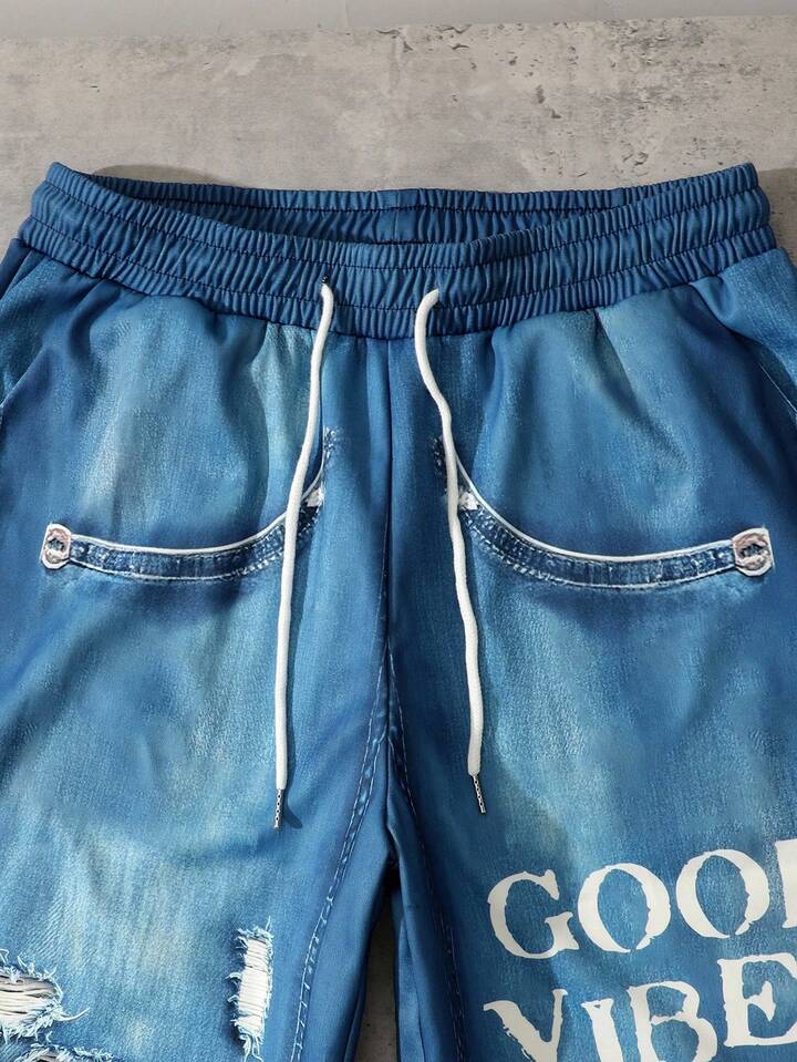 Street Life بنطلون رجالي كاجوال بخصر مرن وطباعة جينز وشعارات
