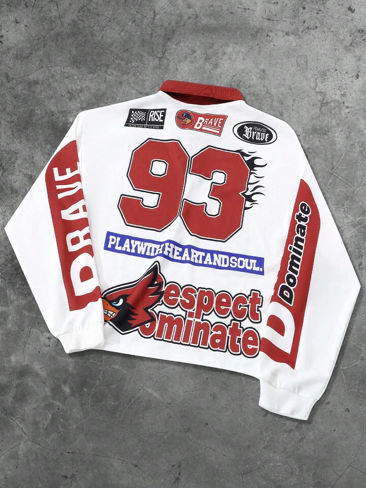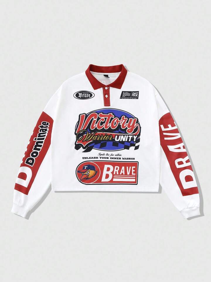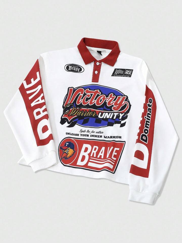 Street Life قميص بولو كاجوال بأكمام طويلة وقصة فضفاضة مع طباعة شعار، للموسم الانتقالي