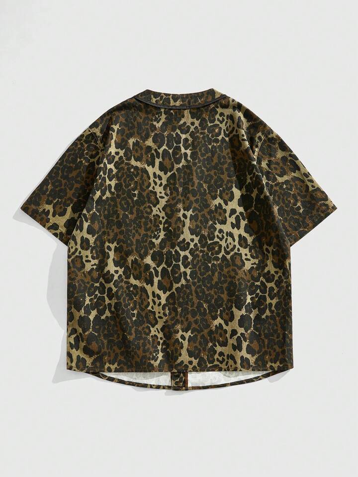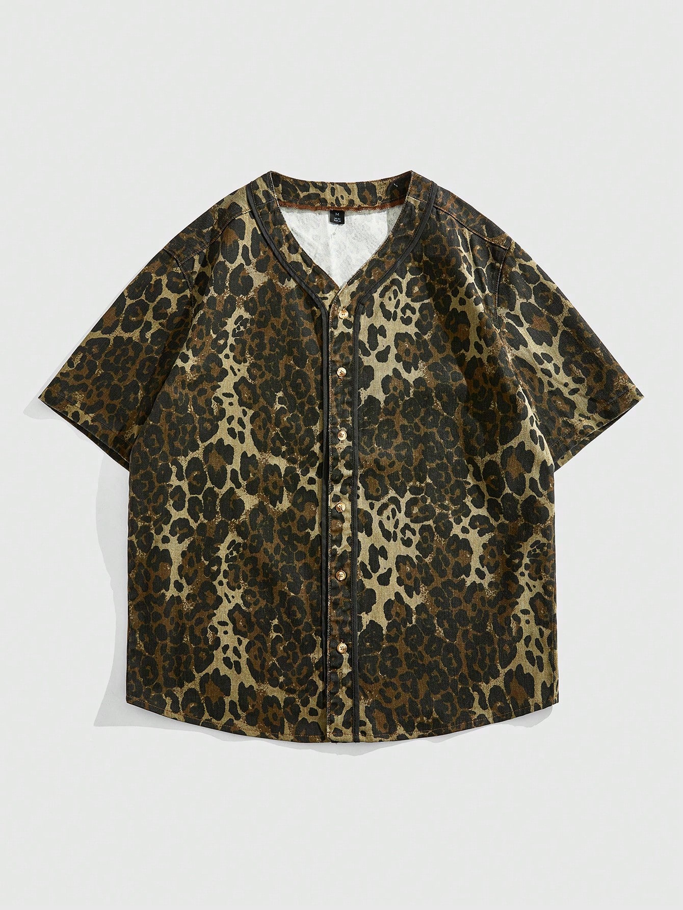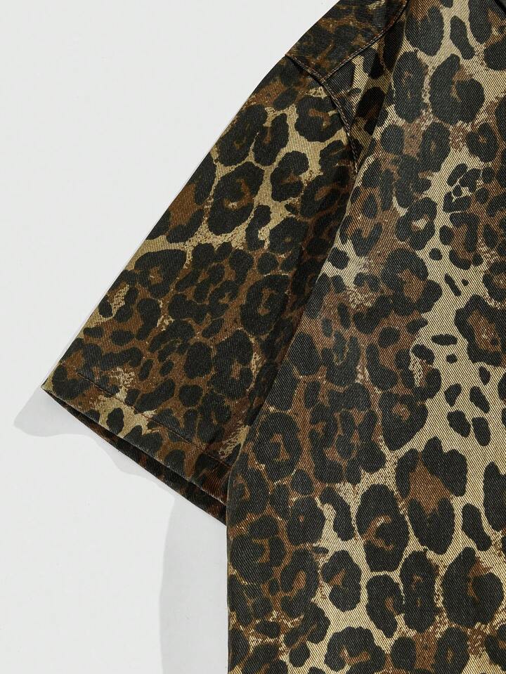 Street Life قميص جينز برقبة واحدة وأكمام قصيرة بنقشة الفهد للرجال