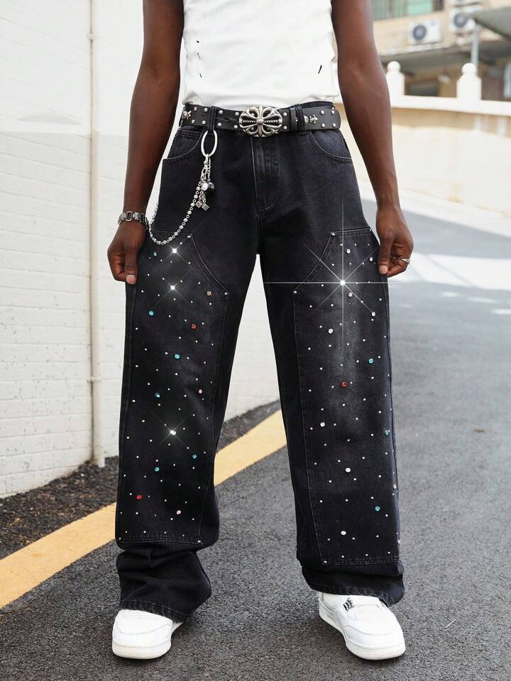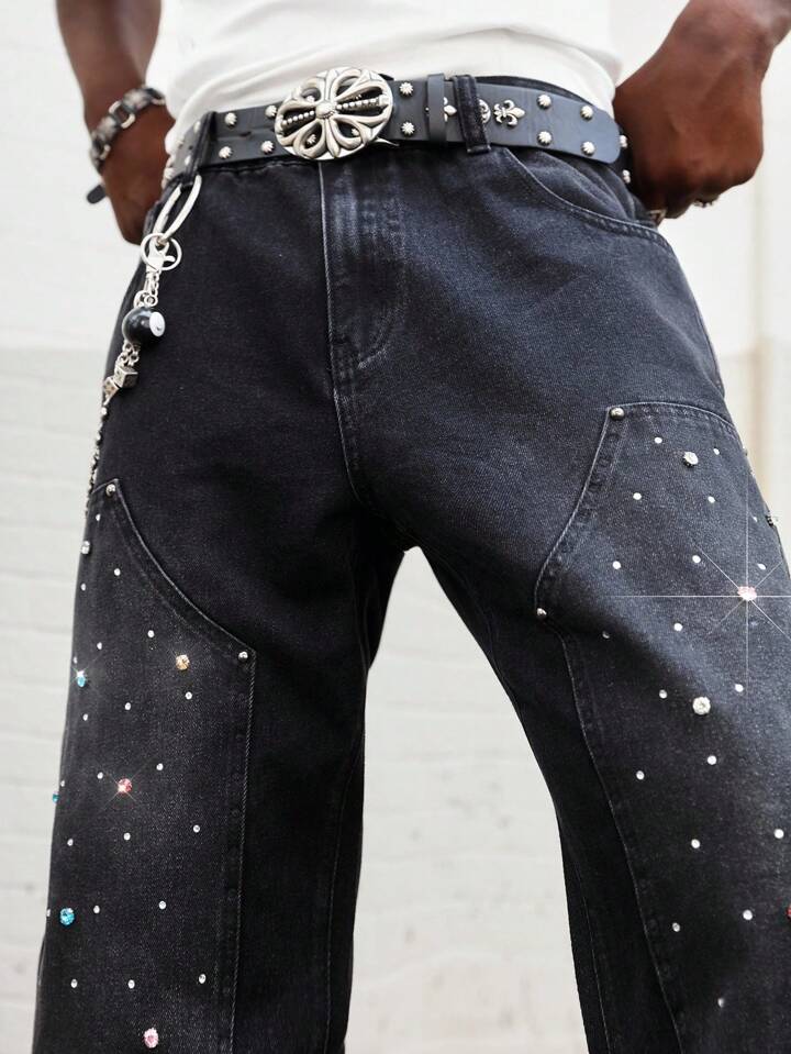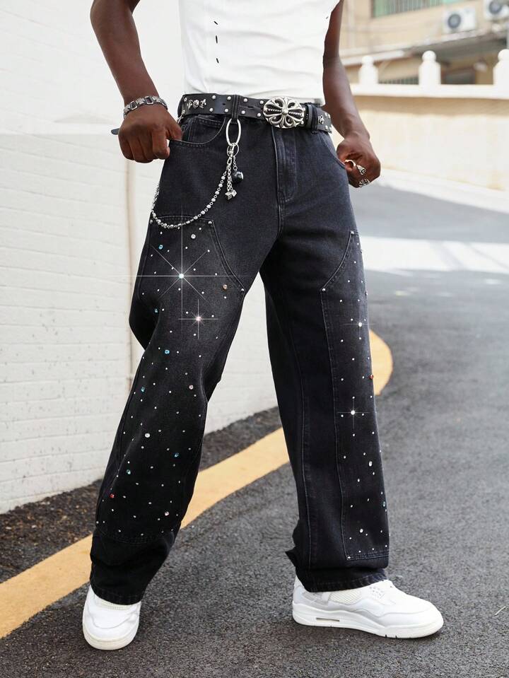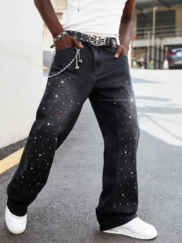 Street Life بناطيل جينز للرجال ذات جيب مرصع بالراينستون، موضة كاجوال