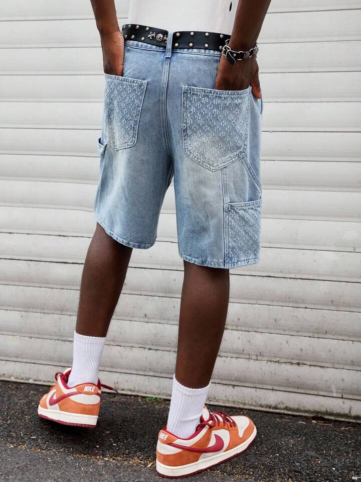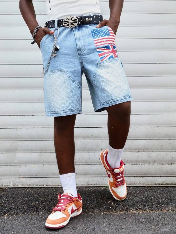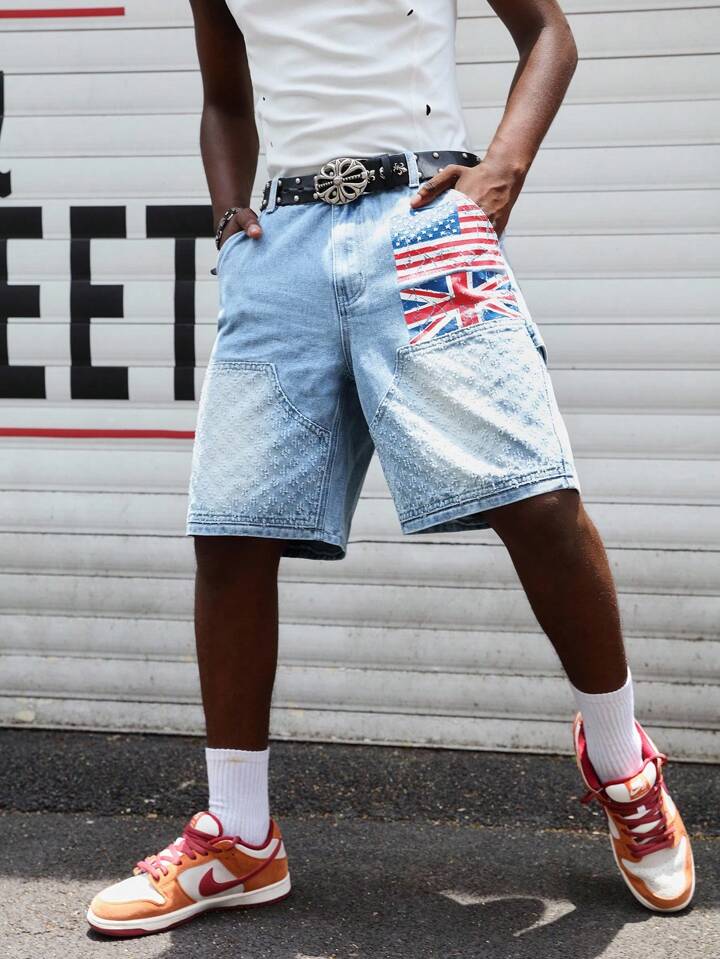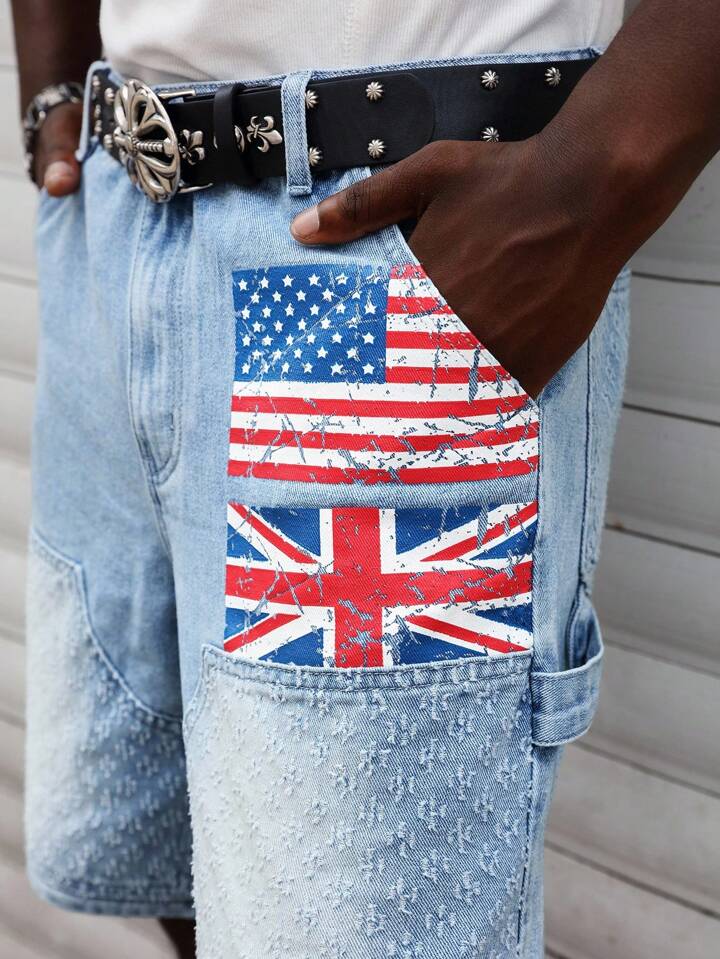 Street Life شورتات جينز للرجال مطبوع عليها طباعة علم وطني مغسول، موديل صيفي عادي