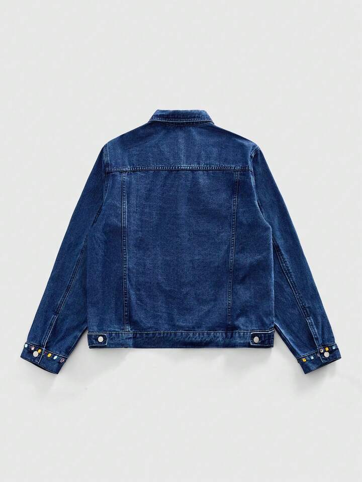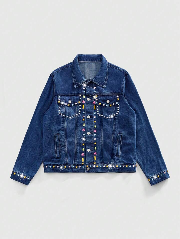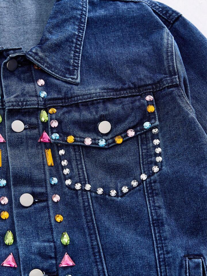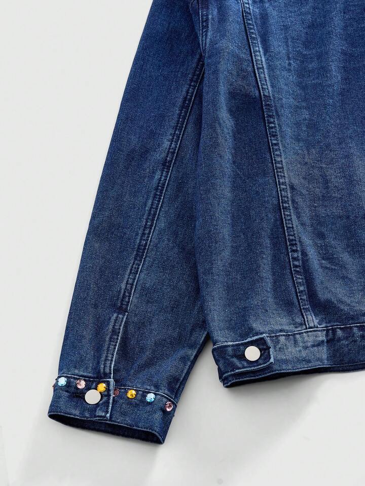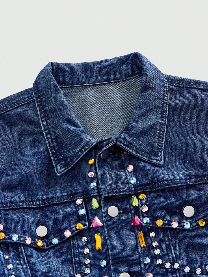 Street Life جاكيت جينز طويلة الأكمام ذات ياقة منقلبة وجيب مرصع بالراين للارتداء اليومي والتنقل